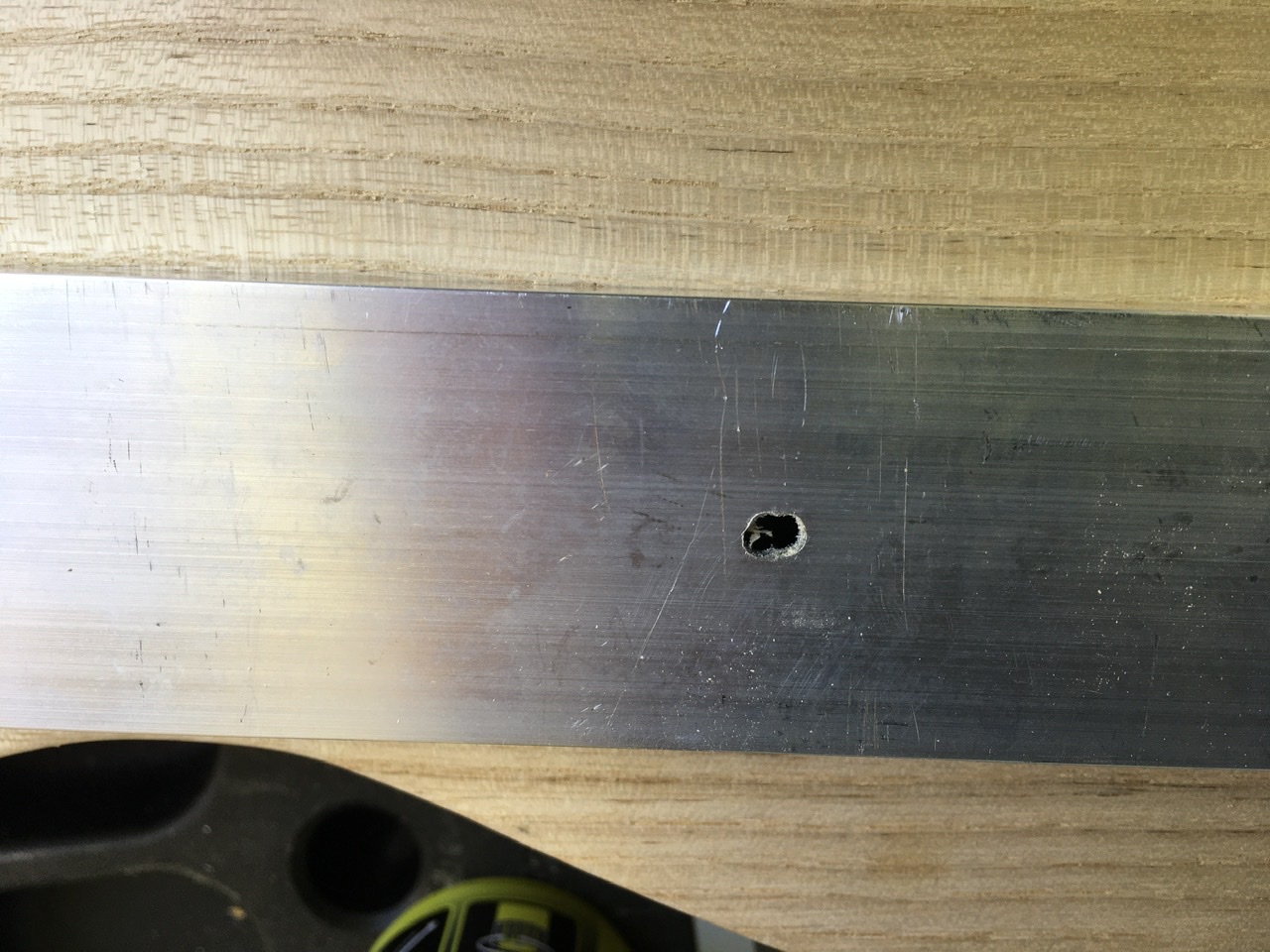 The holes are not straight, I know. The first 2 were with an ordinary twist drill. The 3rd hole (ie, on the left as you look down) was with a Brad point, which gives a more accurate hole, particularly when centre punched.