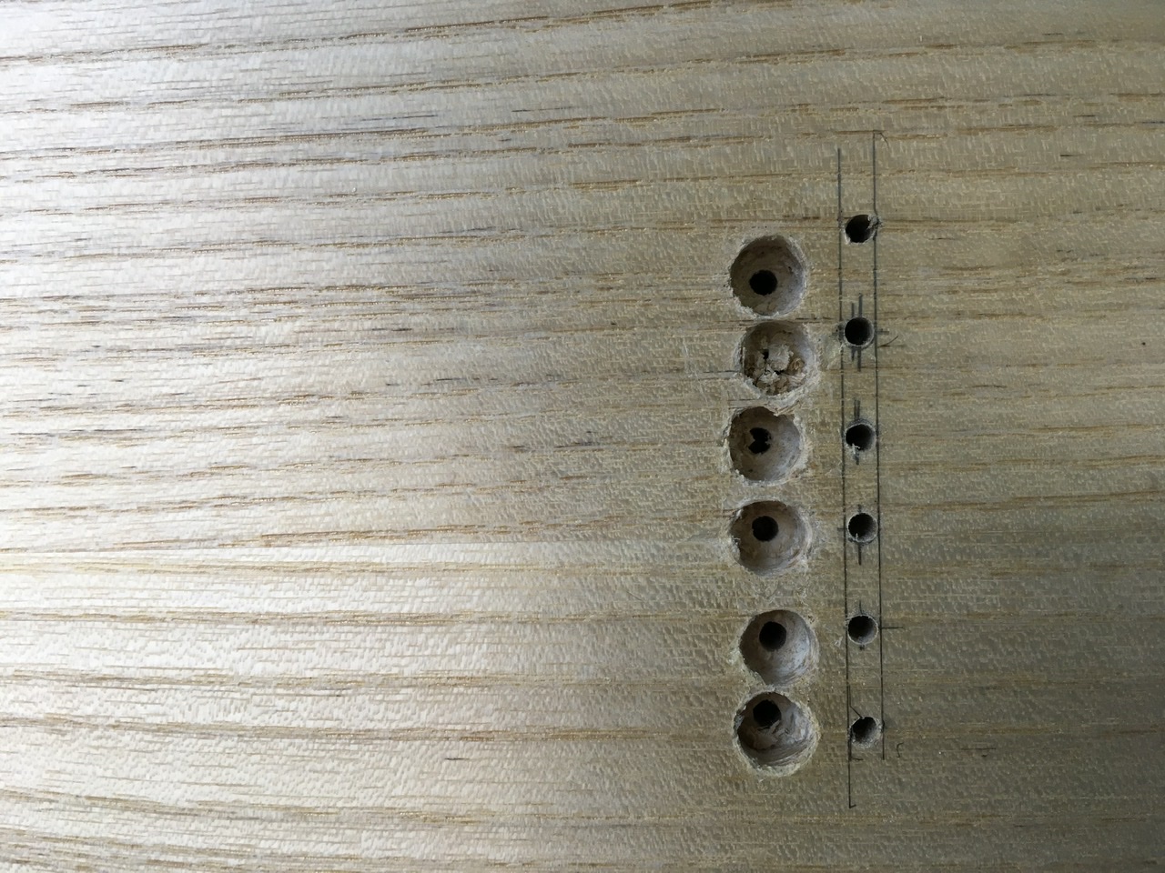 Following that you tube video, I then did really shallow holes through the template, so I had the drill holes centralised and started enough to use the jig to do a vertical drill. It’s hard to see but in the photo above, I have drilled through the template, into the body by about 3 or 4mm...