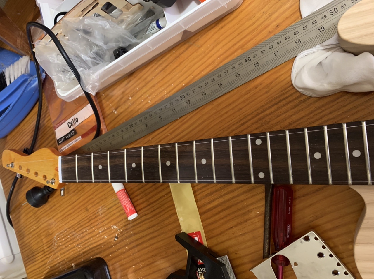 With the neck fixed, I measured scale length from both e string positions, inside the nut and confirmed the measurement from the crown of the fret on the 12th fret. All ok.