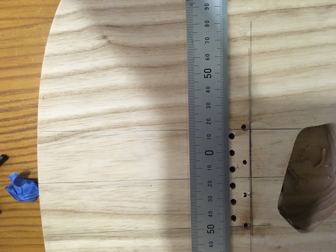 Then I hand drilled the pilot holes at each end of the string through holes through the other side.