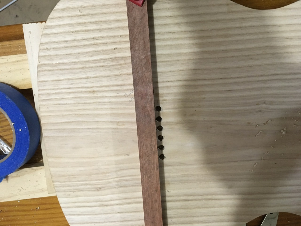 Next step is to mark holes on the guitar body I messed up (and which will be filled with wood filler and top loader bridge installed), mark exactly where the holes for string through should go, centre punch centre of the holes, drill through with Brad points (I can drill straight through...can anyone tell me why that might be a bad idea?????) or go the halfway the flip over method.