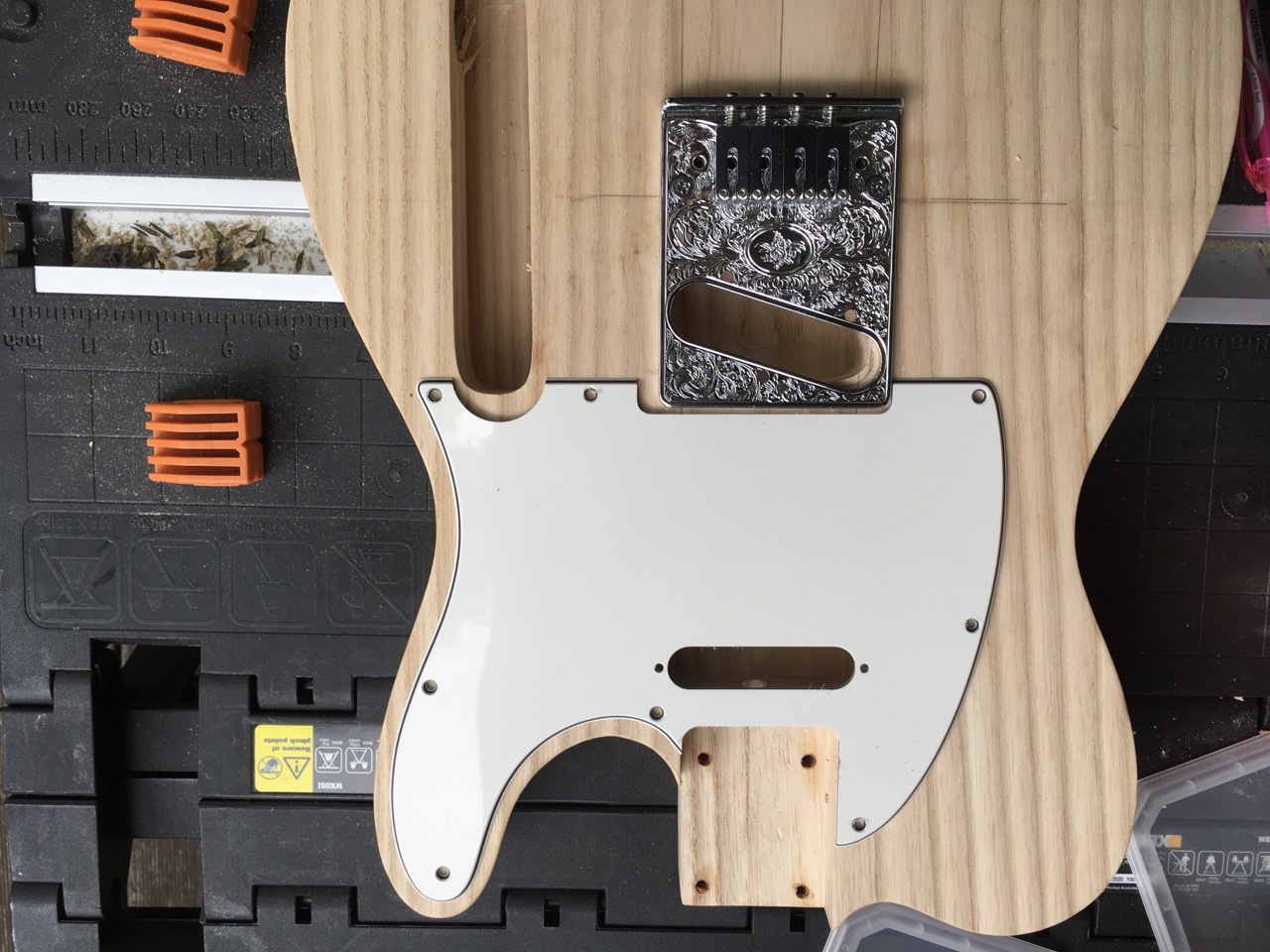 This has the absolute beauty of 2 competing ideas. They being, I get to do a redo on my string through bridge, with a proper drill guide and practising on scrap to make sure I have this right. The second idea is that, when I get another neck and some pickups, I will have 2 telecasters and I can compare top loader with string through.