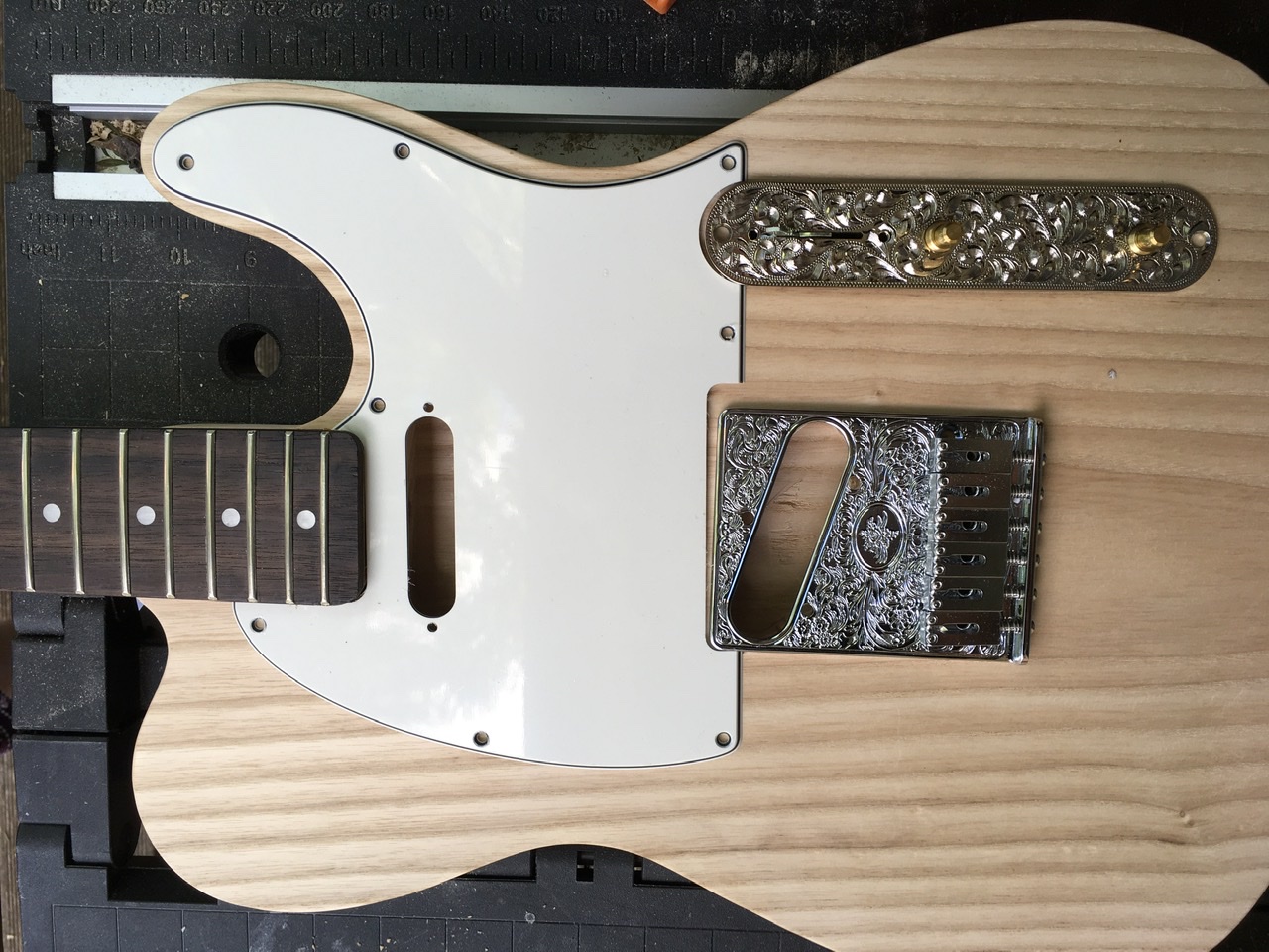 Also, I would suggest fitting the control plate before modifying the pickguard for the bridge to ensure the 3 pieces work together harmoniously. The top edge of the pickguard at the neck pocket looks like it may need a bit reshaping if the guard moves south.