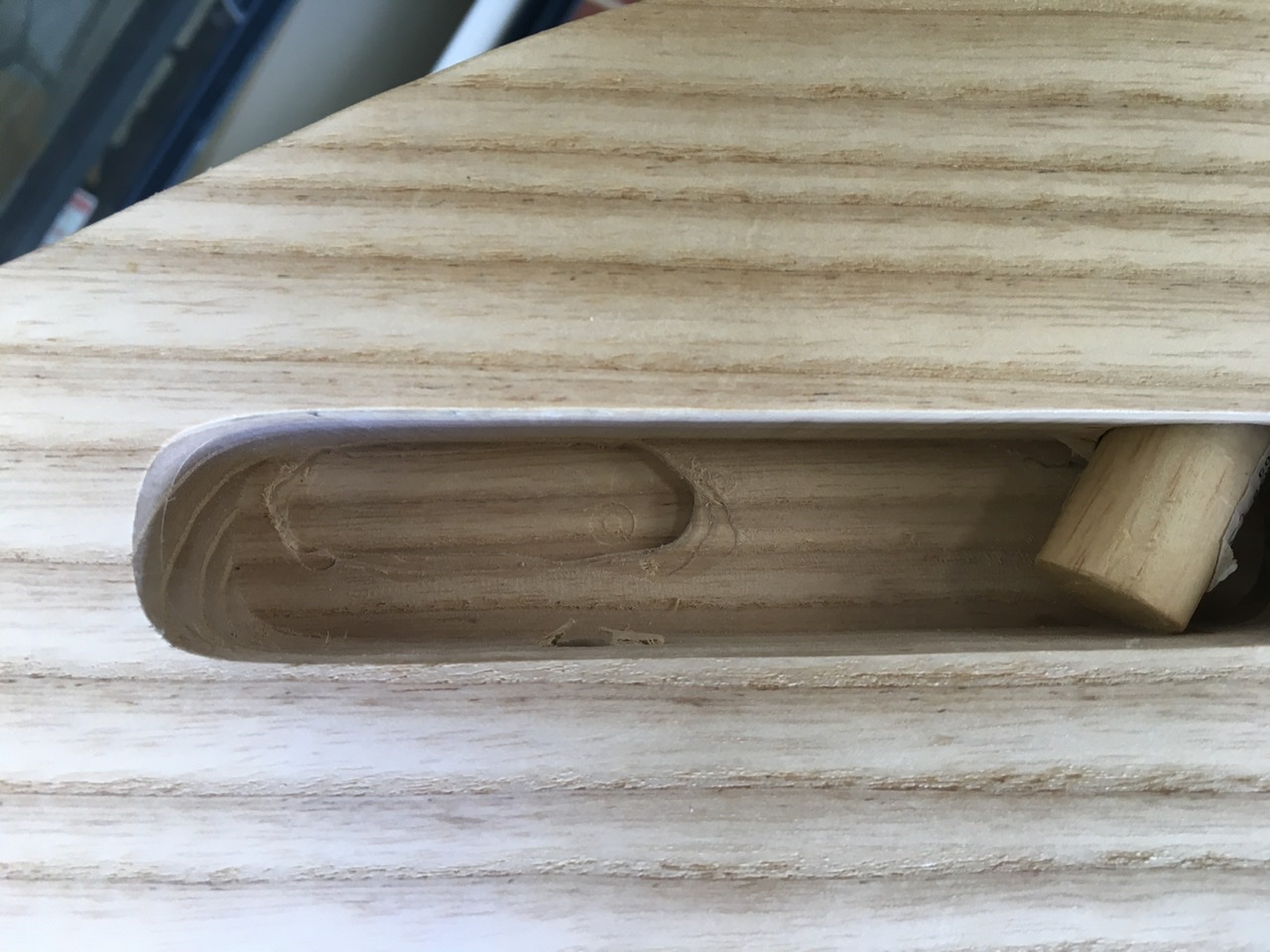 After routing, you will notice that I rushed at the end and took a divot out of the surface. Not waiting until the router had stopped fully. Quite a bit of sanding to go now.