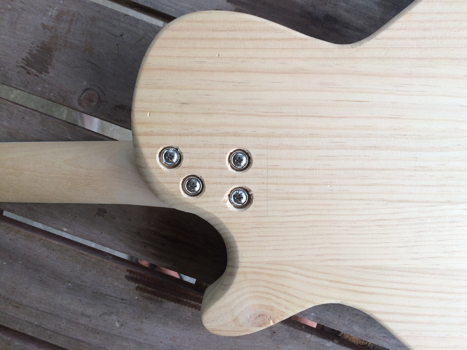 This shows the reshaped neck pocket. I could have positioned the screws a bit better, but I had drilled them before actually deciding how I was going to reshape the pocket. Planning 101 – FAIL!!