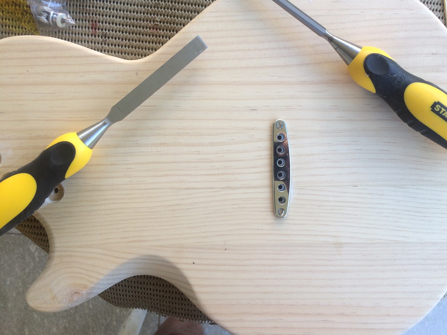 I had 2 options, a) recess out the dodgy ferrule holes and replace with a piece of wood or b) buy one of those “string through ferrule block” thingies. At the time I had decided to stain the guitar so I opted for the ferrule block. I would have loved a solid brass one but budget (yada, yada, yada) meant a cheap chrome Chinese one instead.