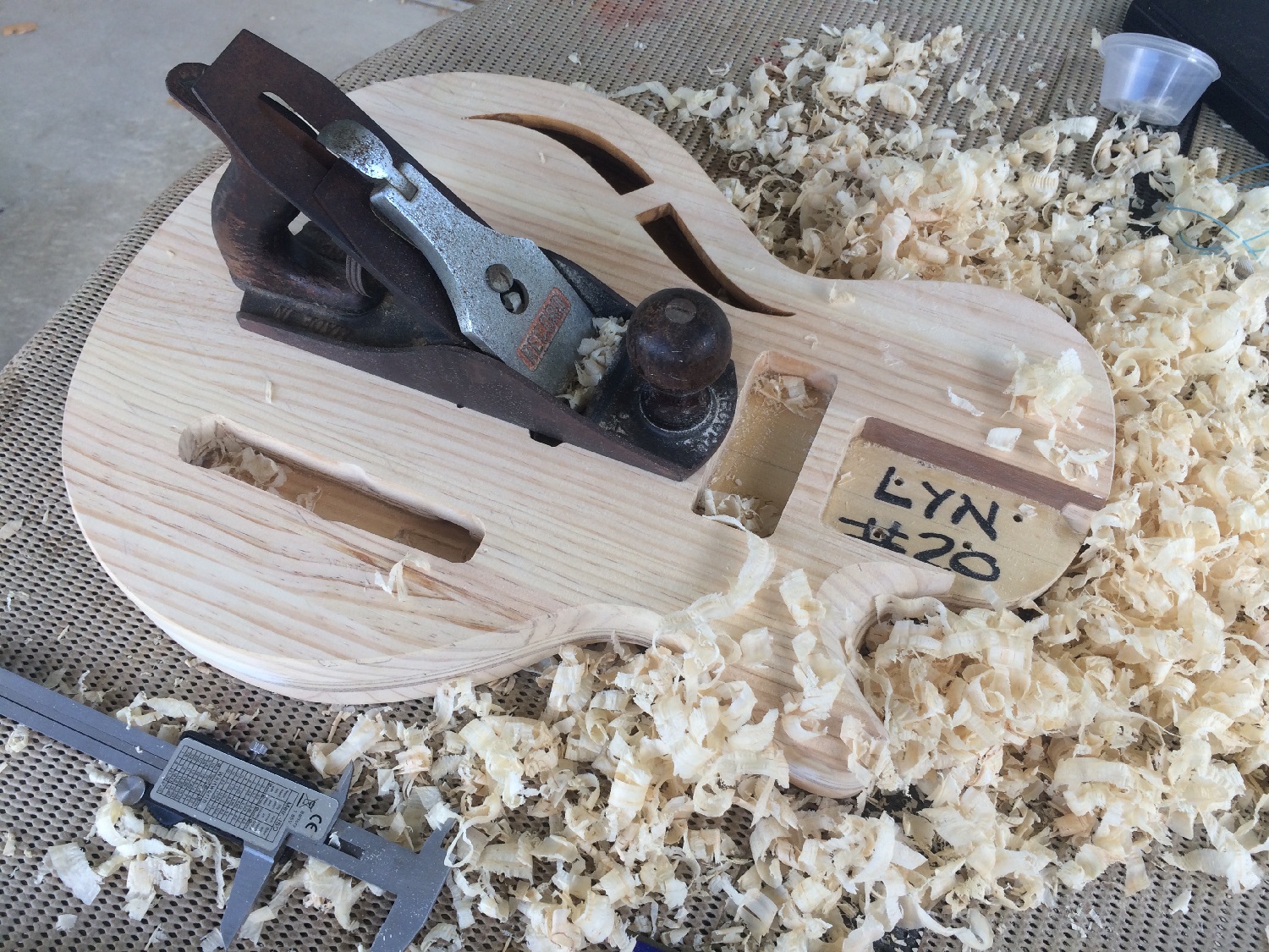 I have 2 options again (sigh) a) shim the neck pocket or b) shave a mm or 2 off the top of the guitar. I have spent a fair bit of time shaping the pocket and the neck and a shim would would mean more work so I have decided to plane a couple of mm of the top of the guitar. Haven’t used a plane before, what could possibly go wrong?