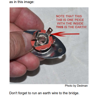 nice. some further questioning, I know now that earth is the guitar community's way of describing a ground wire, where is the right place to contact for the ground? It looks like it could be the bridge itself but I'm not entirely sure.