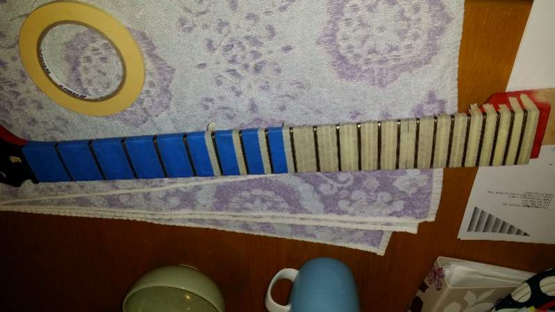 Taped up the fretboard and levelled frets with my long spirit level with sandpaper double sided sticky tape attached along the bottom edge. Only one troublesome fret #15 that was quite low and took a bit of work to bring it's neighbours down to its level. Next job recrowning, then glue on neck and shielding.