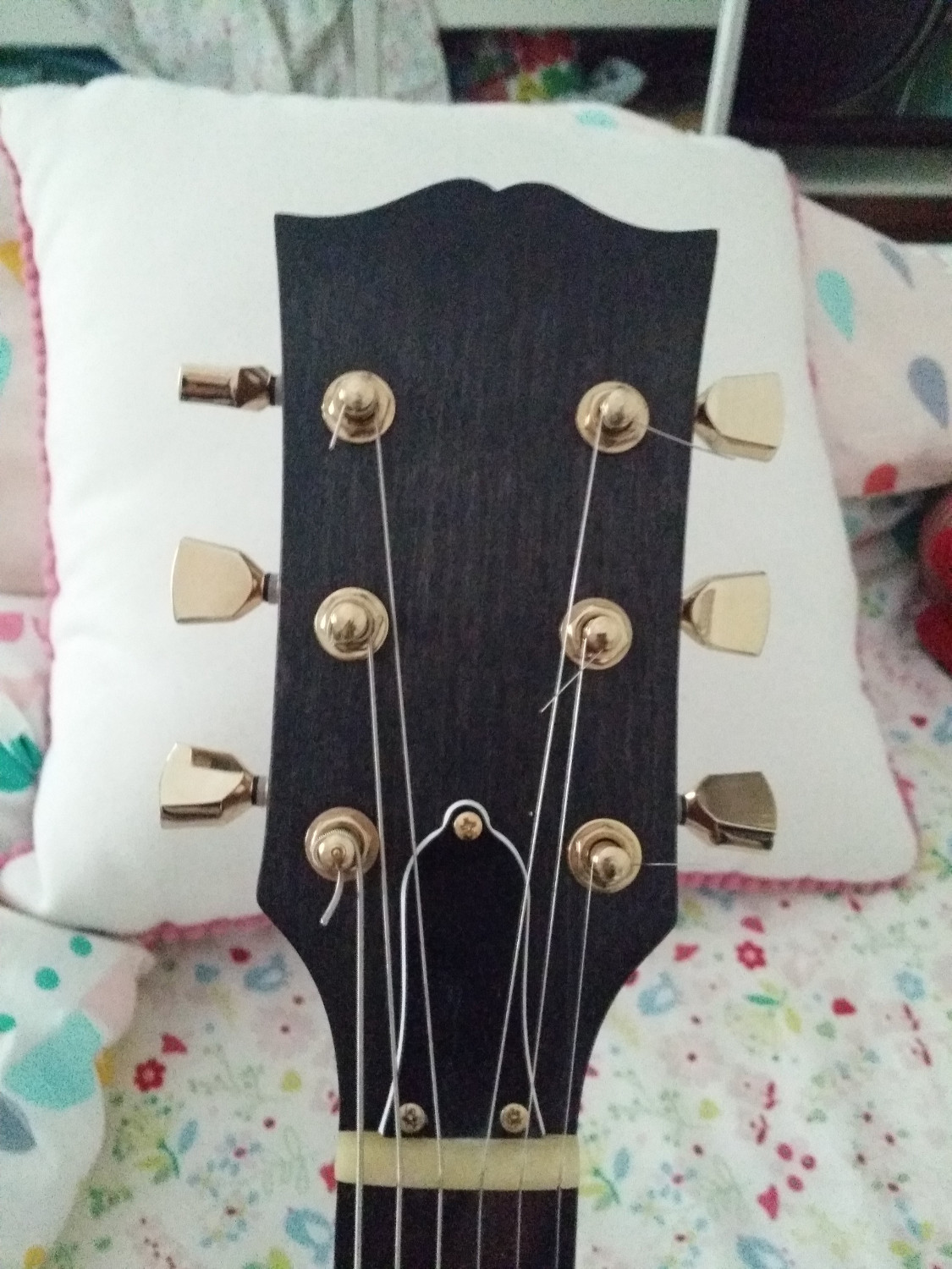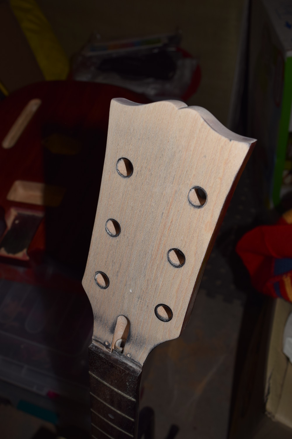 And back to the ES-1G. This guitar has been fantastic to play, but I was never quite happy with the headstock. So, off with the tuners! I reshaped the top with some small files, then sanded back the face to remove the old logo. I will then re-dye with black FW (the colortone I used wasn't quite dark enough) and use same logo style as on my LP-Jnr which (in my opinion) is a more discreet design. Whilst I'm at it I will also pick up a set of Gotoh SG301-04 tuning keys to replace the stock ones.
