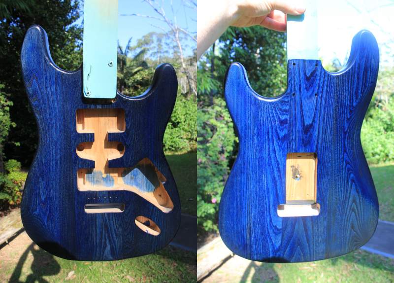 Well, an interesting day. I attempted my black burst with less than optimum results. It was interesting - the ash seemed to get to a stage where it had as much colour as it was going to take, and any more application of black dye wouldn't take like i needed it to. Anyway, looks like my rubbed-burst method needs some re-thinking - at least for ash.