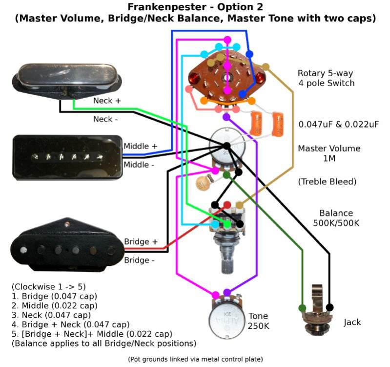 Option 2: Master Volume, Bridge/Neck balance, Master Tone with switched caps.