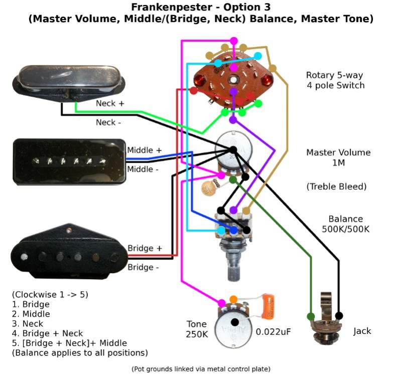 This one has the balance pot set up with the P90 on one half, and whichever of the currently selected Tele pups on the other half. So, if you have the balance set at 100% P90 and 75% 'other' it will give you 75% Bridge in position 1, 75% Neck in position 3, and 75% Bridge + Neck in positions 4 & 5. Or, the reverse, set it to 50% P90 and you'll have 50% P90 in positions 2 and 5 with 100% on the Tele pups in positions 1, 3, 4 & 5. Again, this needs all the poles on the switch so no tone/cap switching.