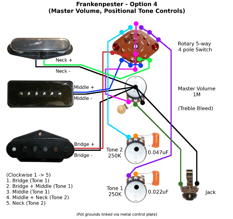 Ok Pest, I've got some diagrams for you... 5 of them in fact. These are just some ideas using the bits you have available, but if you have a particular combo of the features you want just let me know. All have a treble-bleed on the master volume.