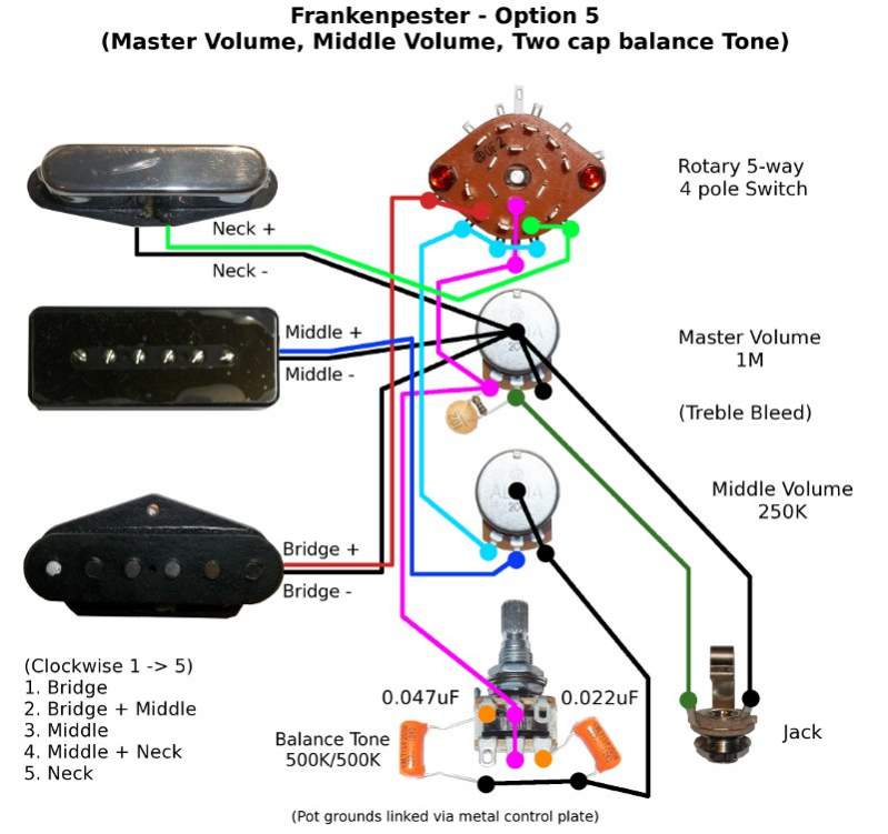 Option 5: Master Volume, Middle Volume, two cap balance pot Master Tone.