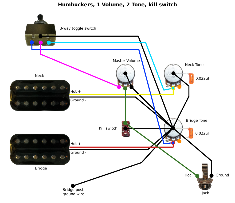 now ive been thinking about the wiring for this beast of a guitar, i dont want to get too crazy with it because this is going to a newbie guitar player, so i was thinking of just throwing in a killswitch, simple yet elegant, because i really hate the 2 volume thing, not to mention it would just confuse the missus. I hope wierdy gets a look at this and can help me :p