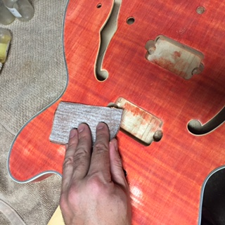 I have had similar issues with my EX-5 and just put it down to more humidity in South East Qld perhaps? DT stain coats went on fine then applied intensifier a couple of times but started to notice what looked like dust particles had been attracted to it whilst slightly damp? After Woks suggested light 0000 steel wool between coats that took care of the dust particles but it still had similar dry matt patches like Damo's guitar. Applied a top coat and probably had cotton square a bit too wet and it ended up with a few runs here and there. Went to lightly sand with 0000 steel wool again and the finish just rolled up in little gummy balls all over the place as if it had not dried properly? It had been left to cure for more than 10 days in what was pretty stable conditions. Ended up having a go with 400 grit as mentioned above and it only made things worse so had to go wet & dry which took things back a long way as if there was only one stain coat applied.