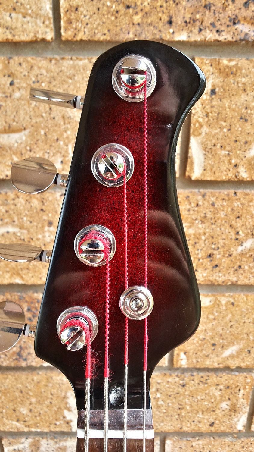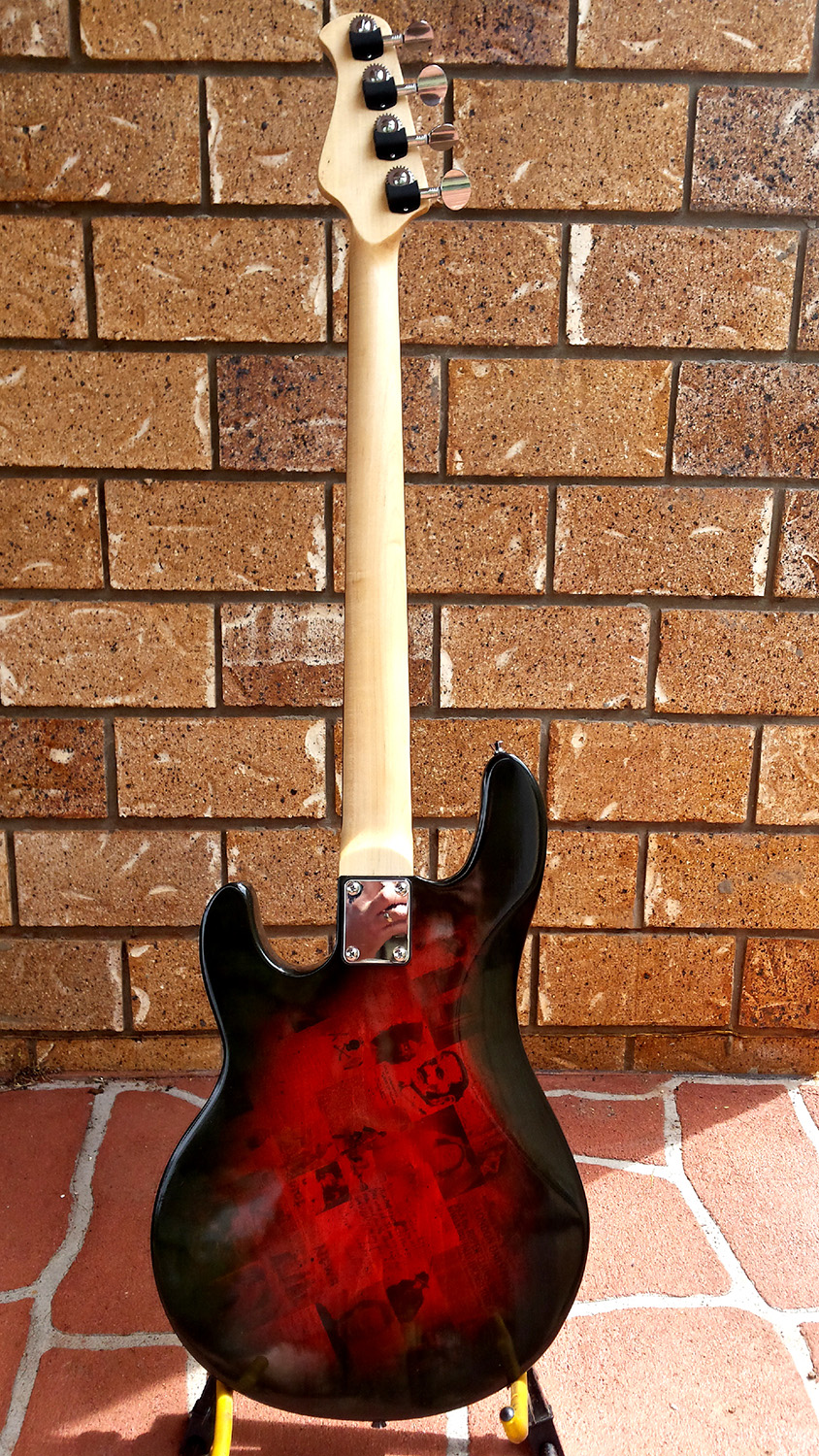 “Of course what jumps out at me initially with this bass is the fantastic use of the print on the back. This has been so expertly-applied, and adds so much character to the bass. The rest of the build is solid, well done, with a professional factory-feel. There seems to be a finish issue around the 1st string machine post at the headstock, some clear-coat lifting? This is a bass that needs to be played on stage, it’s wonderful.”