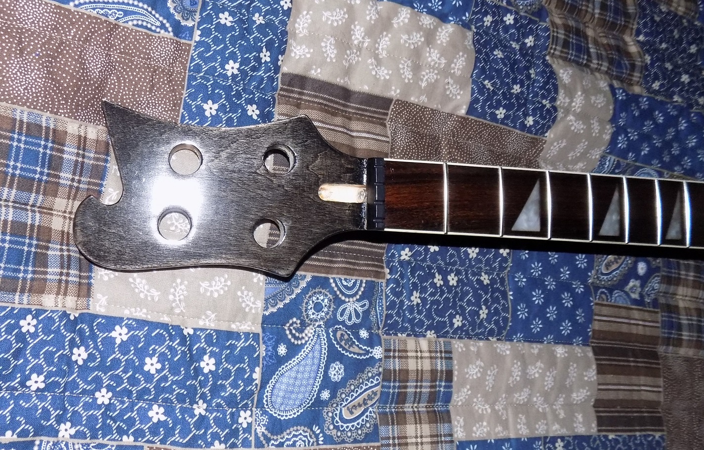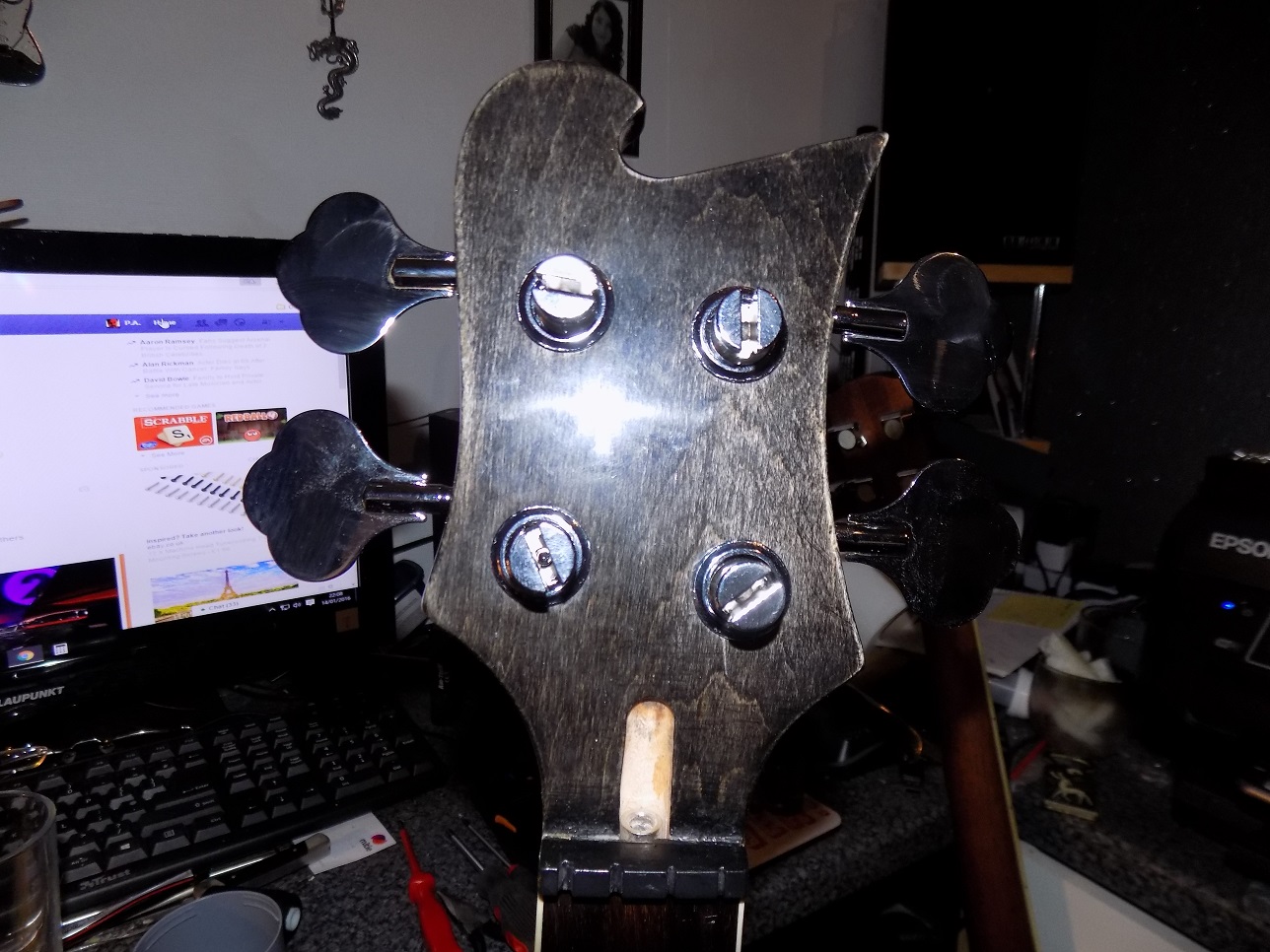 Well totally pi$$ed off, attempt to secure the machine heads even with pilot holes 2 screw heads have snapped off, talk about cheap garbage steel. Gonna have to work out how to extract whats left of the screws from the timber without doing too much damage, not impressed one little bit.