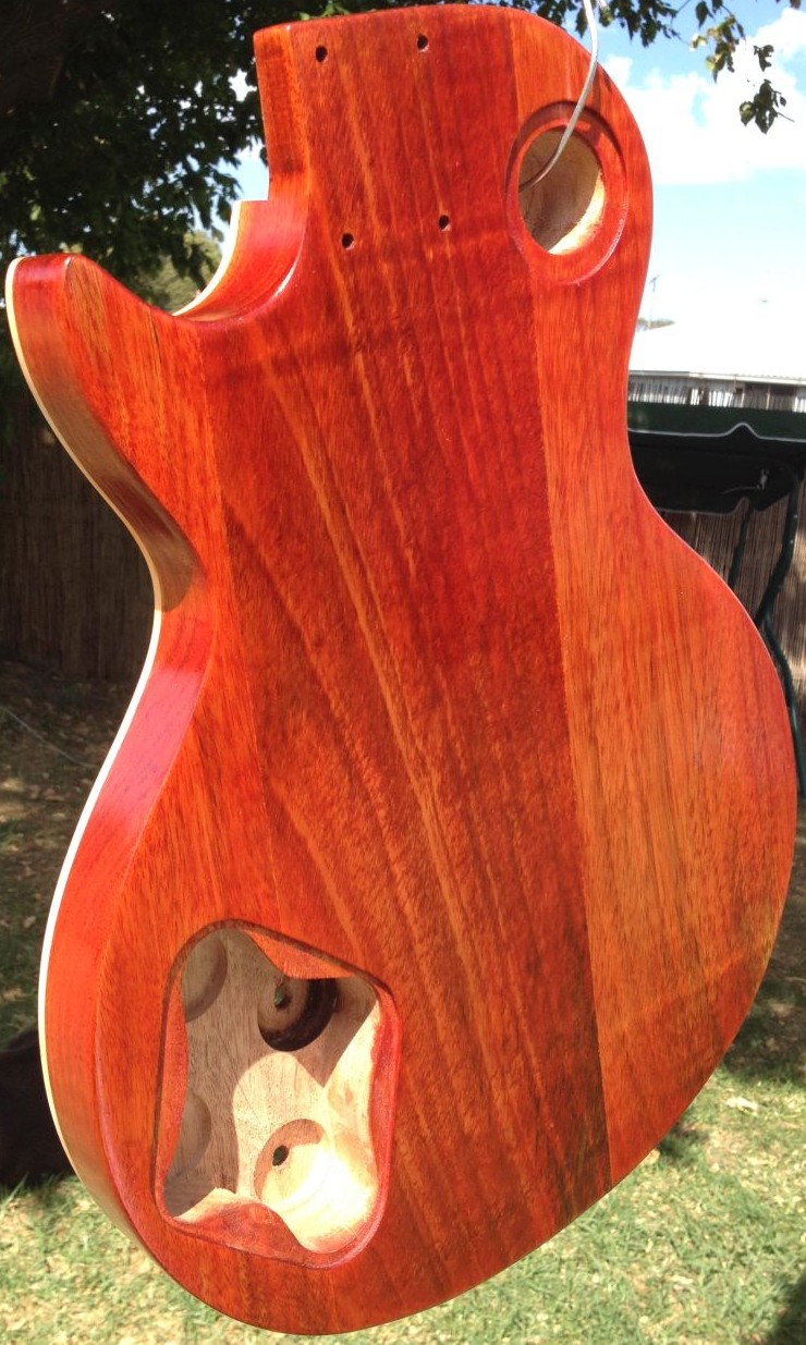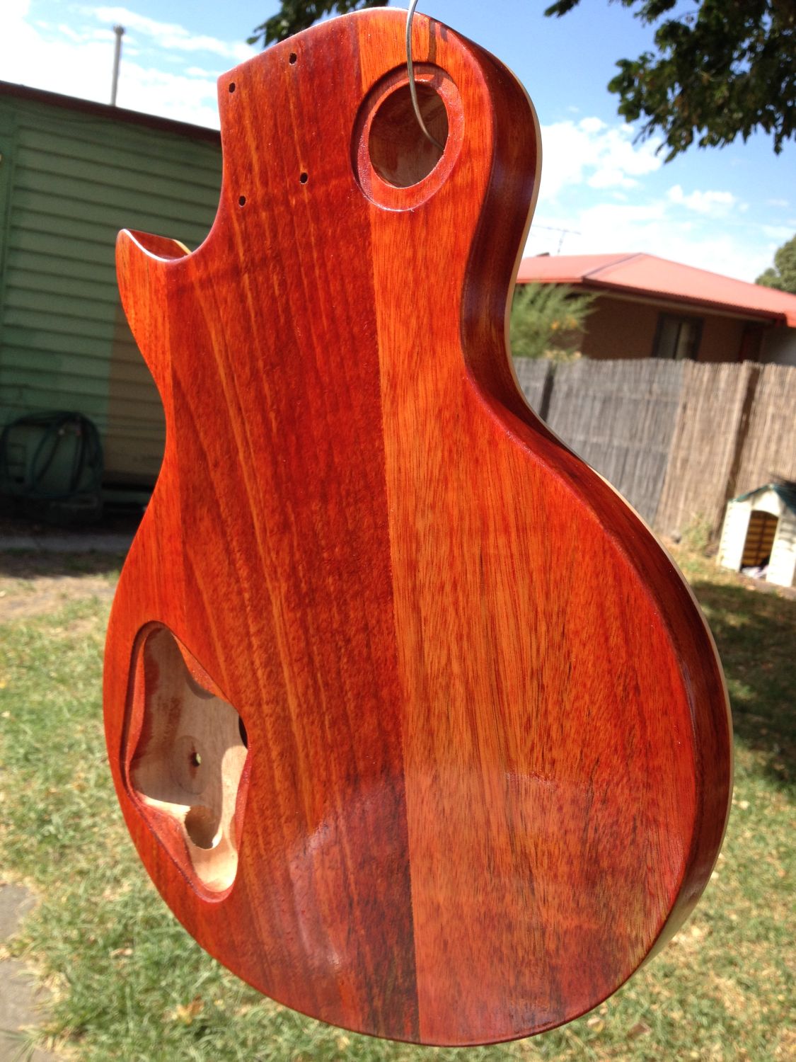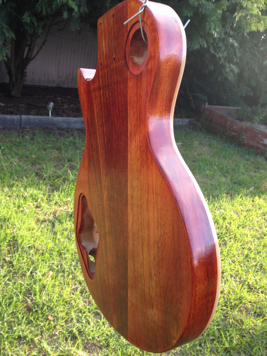I toyed with the ides of doing a traditional Les Paul design but in the end went with my own simple asymetrical swish type of design.. Still needs retouching with stain/finish and a little more sanding Attachment 8885Attachment 8886Attachment 8886etc, but overall.. it looks ok I think... What do you guys reckon??