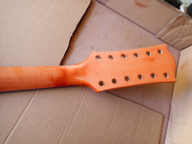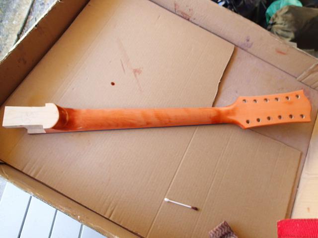 I had some lighter color stain left over from the back, so decided to attack the neck with it, its lighter than what i will use. Wipe on a a bit of colour tint and you see old Mr Magloo rear his ugly head.