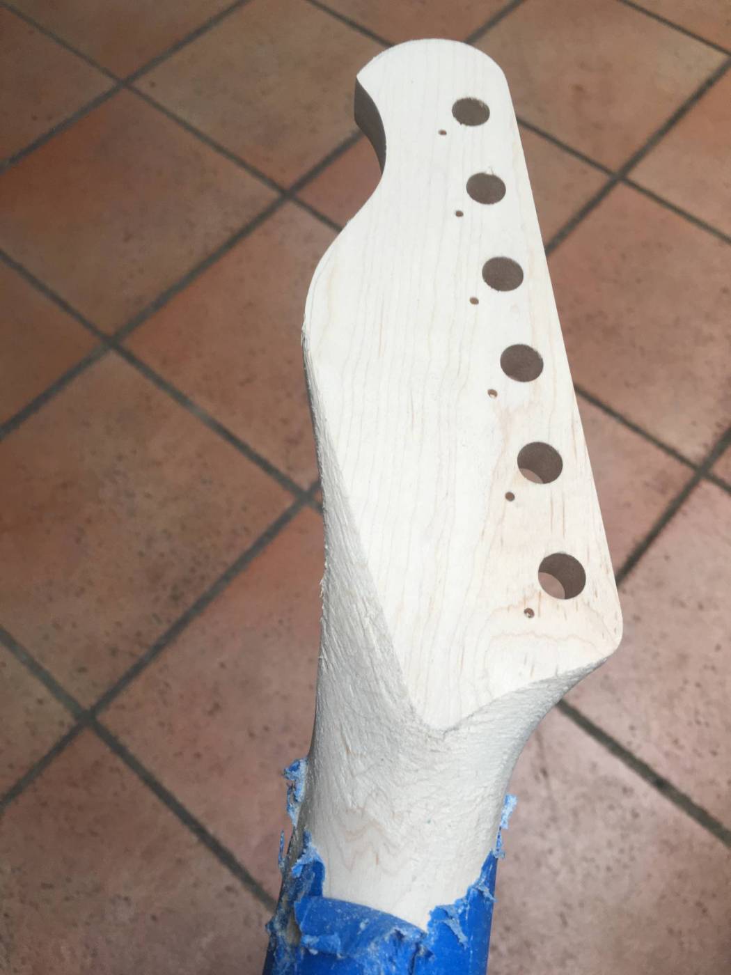 The fender template I used as the base for the shape has some shaping to do to the back of the headstock. Out came the wood rasp resulting in this: