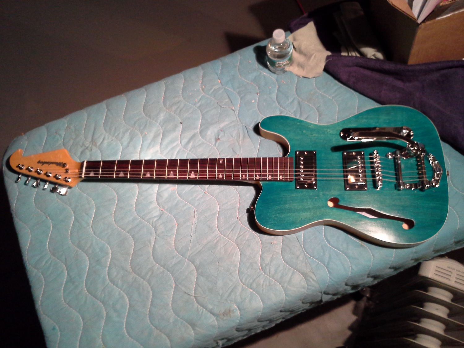 So far, so good; everything fit pretty well, even if positioning the whammy was a bit of a Hail Mary. What you see is everything from the kit - no upgrades. The neck needs to bow a bit more - I tweaked it and will let it sit with tension for a while and see what happens. Miraculously (and I hope this is some kind of sign) the intonation is fairly spot on. I need to do the usual set-up tweaks to get it right (and possibly a smaller spring for the whammy), but my quick test tells me that it has a nice sort of hybrid sound - fairly bright, but with some warmth from the humbuckers.