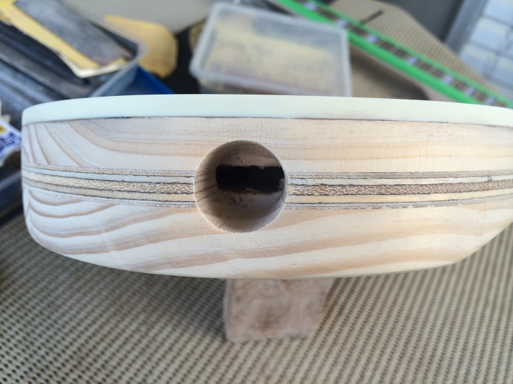 Next job was to drill the string-through holes. I am finding that although I am using good quality bits I am getting a fair amount of tear out. I think that using a hand drill tends to tear the wood rather than cut it. But I am not too concerned as the tear outs on the top will be covered by the bridge and at the back the string ferrules will cover most of the mess.