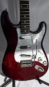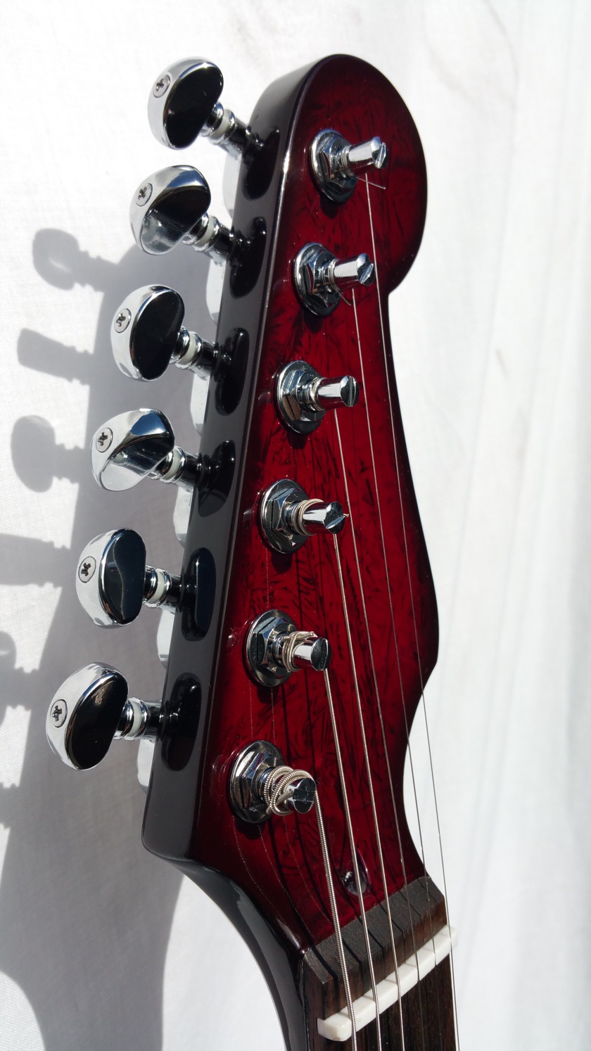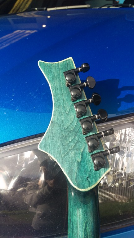 Next came a light black airbrushed sunburst around the body, neck and headstock followed by 5 coats of Port Red candy (5% concentrate mixed with acrylic clear ). After the candy came 5 coats of clearcoat. Sanded back to a flat surface and then bought back to a deep shine with cutting compound and auto polish.