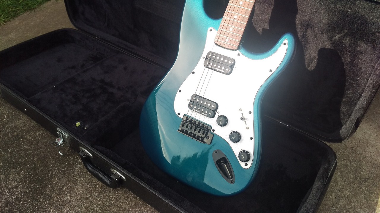 What a classic STA-1. Surf green, vintage yellow neck. Love it. The pearloid pickguard looks really good and I love the decal.