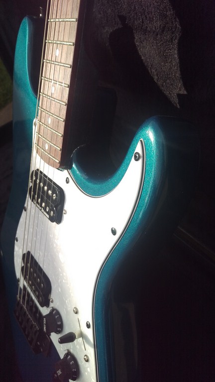 Classy guitar, well finished, love the headstock. A very different take on the ST kit. I like the headstock shape but it’s a shame that the neck’s colour didn’t match the body.