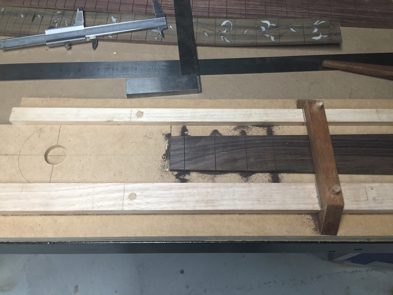 I have another Rosewood board and an ebony blank that I'm not ready to hack to bits yet, and I will probably leave it be until I can sort out more accurate marking arrangements.