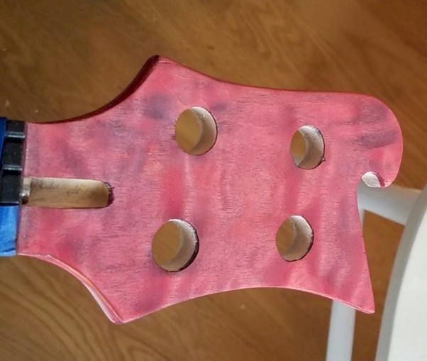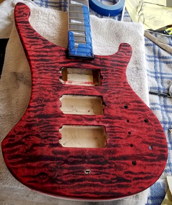Absolutely...my wife had a good idea on that...I'm going to sand the veneer off and paint the head stock black (the back of the body and the neck will be black). THEN I'm going to take a piece of the material I used for the body top and make a Rickenbacker-style truss rod cover finished to match the body. That should actually look really cool...as if the red and black quilted maple was carrying through, under the fret board, to pop out over the nut.