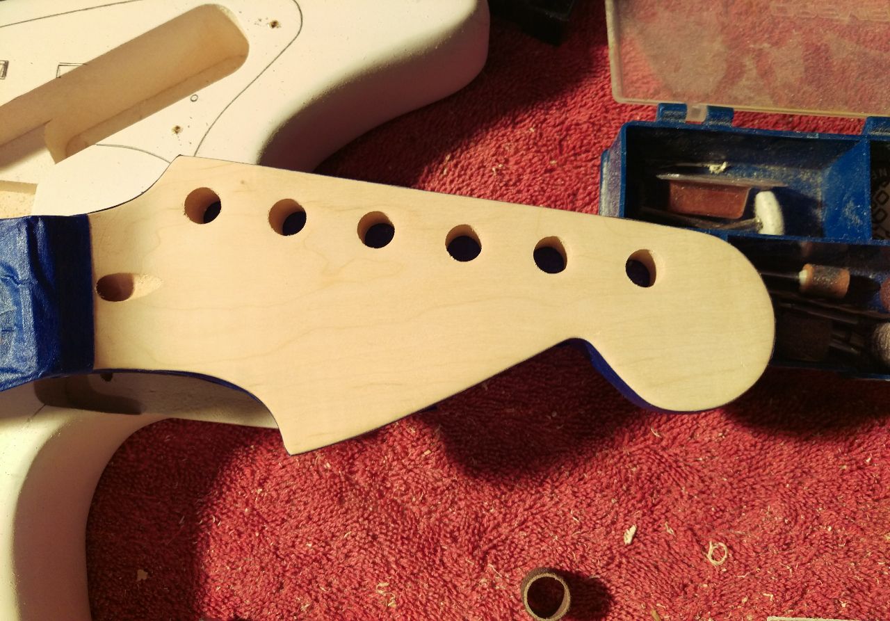 While waiting for the new pickguard blank i decided to do a little work on the headstock. I sharpened the under curve so it would emulate the Jag a bit more.