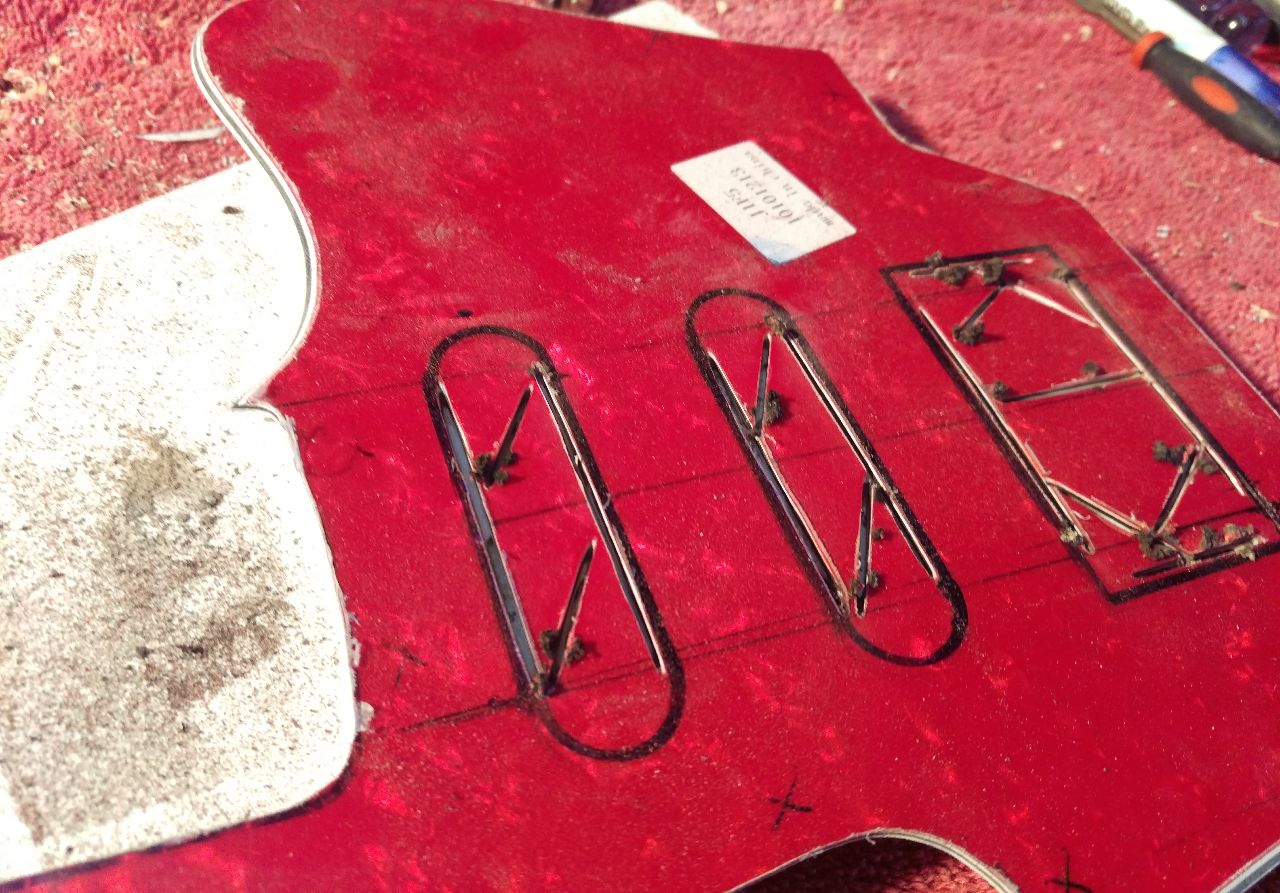 Time to do the pickguard, it has arrived. Used one half for trial, so easy to botch up using wrong tools. When i got the hang of it i used some measurements from the supplied one then modified the rest. First pic shows how the original pick doesnt fit.