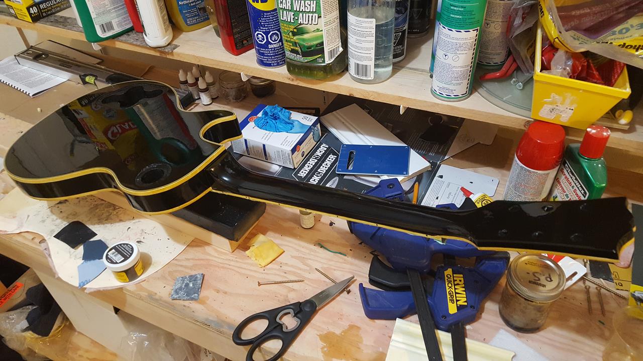 I'm in the middle of the finishing stage at the moment. I have a few coats of amber tinted poly on and the binding and headstock logos are starting to yellow nicely. I think it's pretty close to time to switch to clear coats.