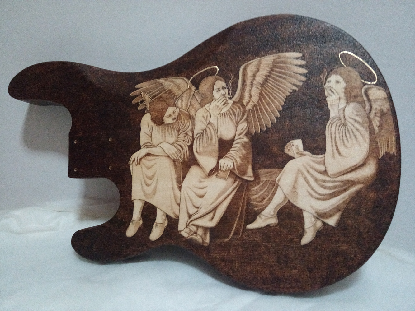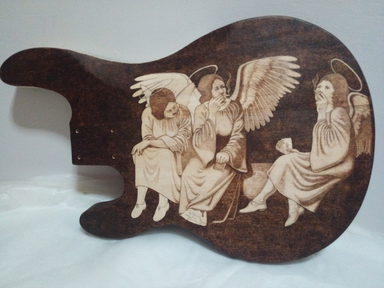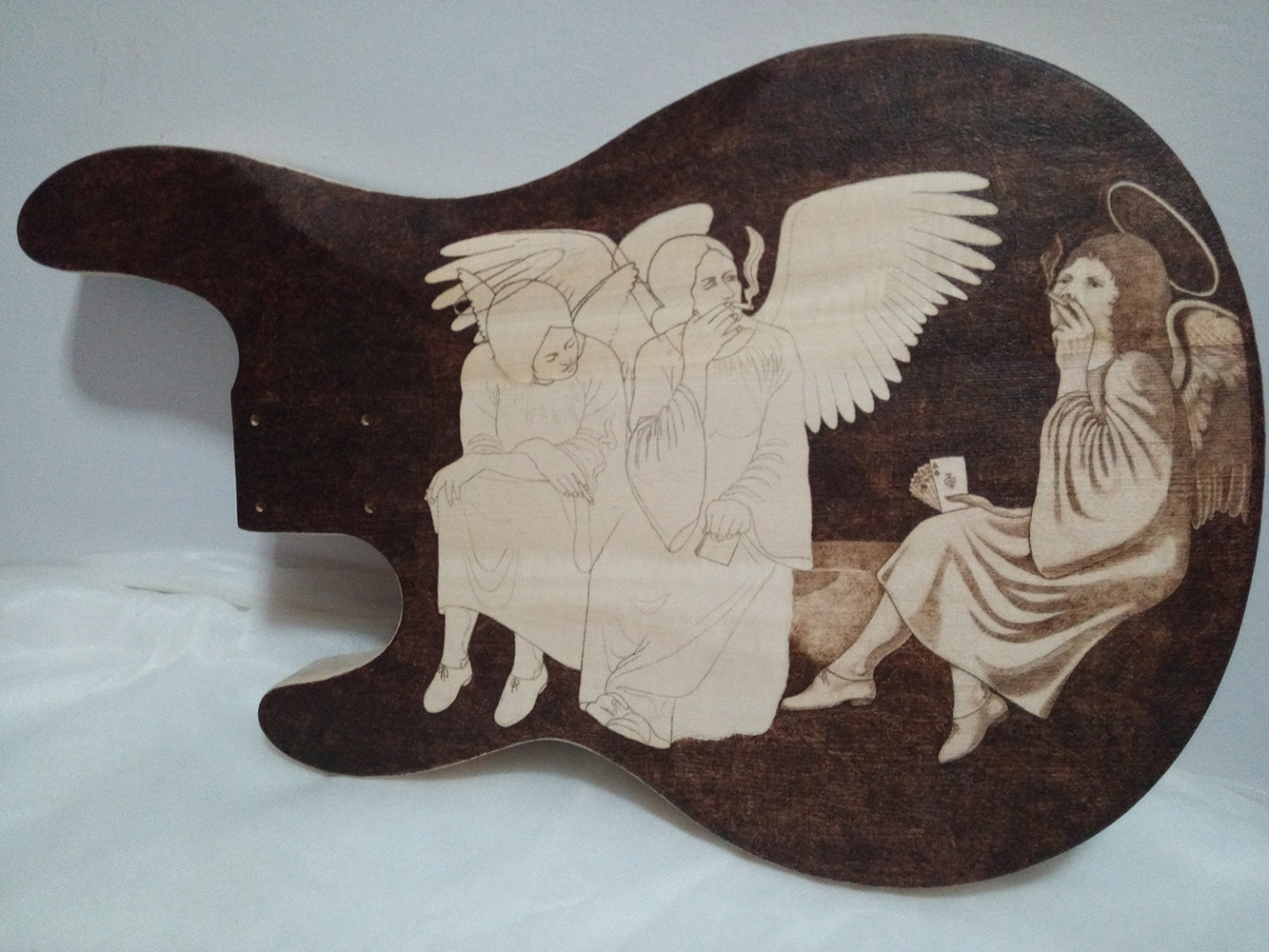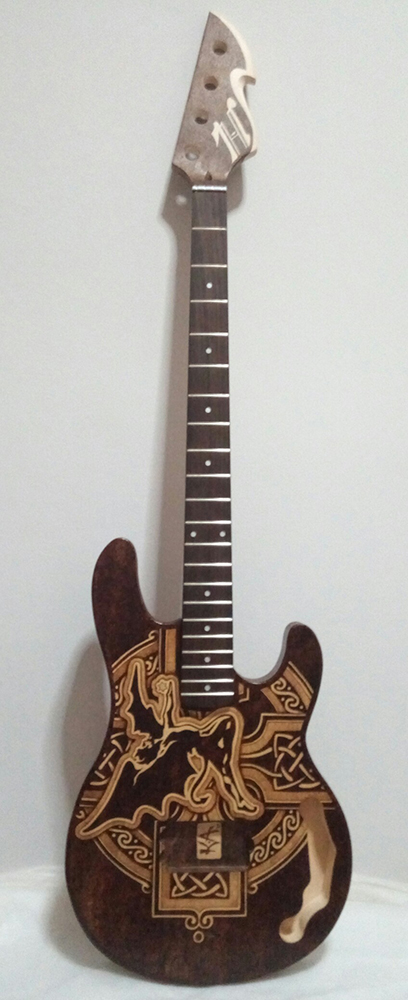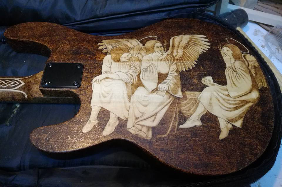 I'm almost lost for words. The time, effort and intricacy in creating this burned masterpiece is just mind-boggling. Angels and demons with hints of celtic and norse elements, you could spend hours just admiring it. The black hardware is the perfect subtle choice with the body colour, and allows the burning to shine without distraction. The only slight detraction for me is the headstock shape makes it look slightly over-sized to my eye. I love the shape, but it just seems a touch large. Stunning build.