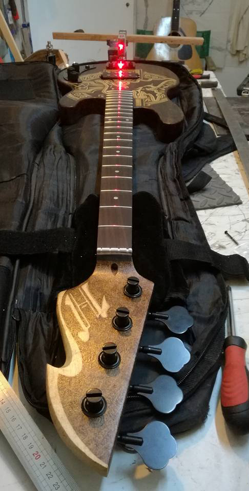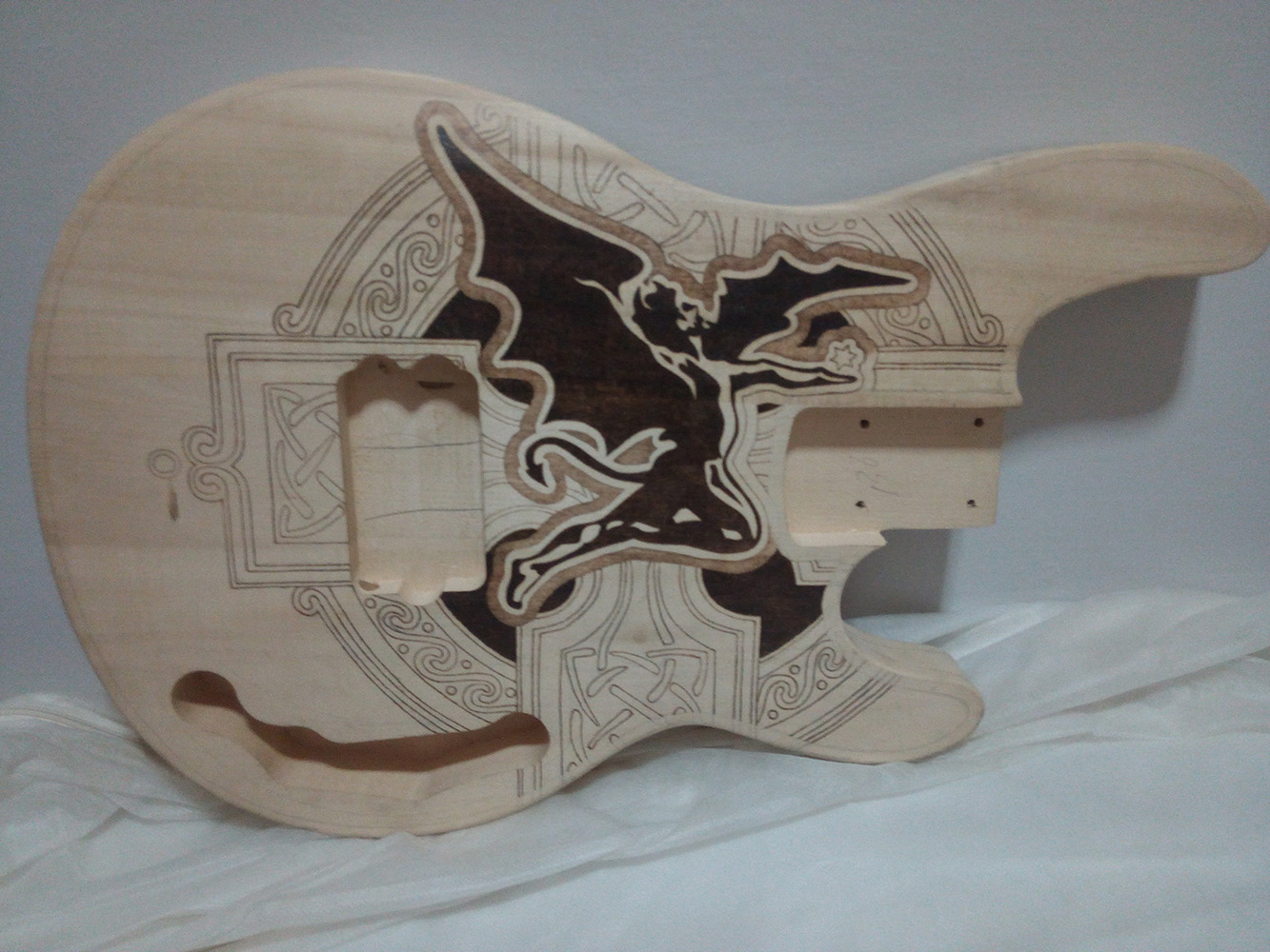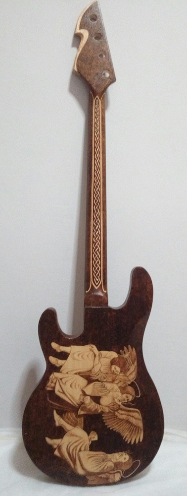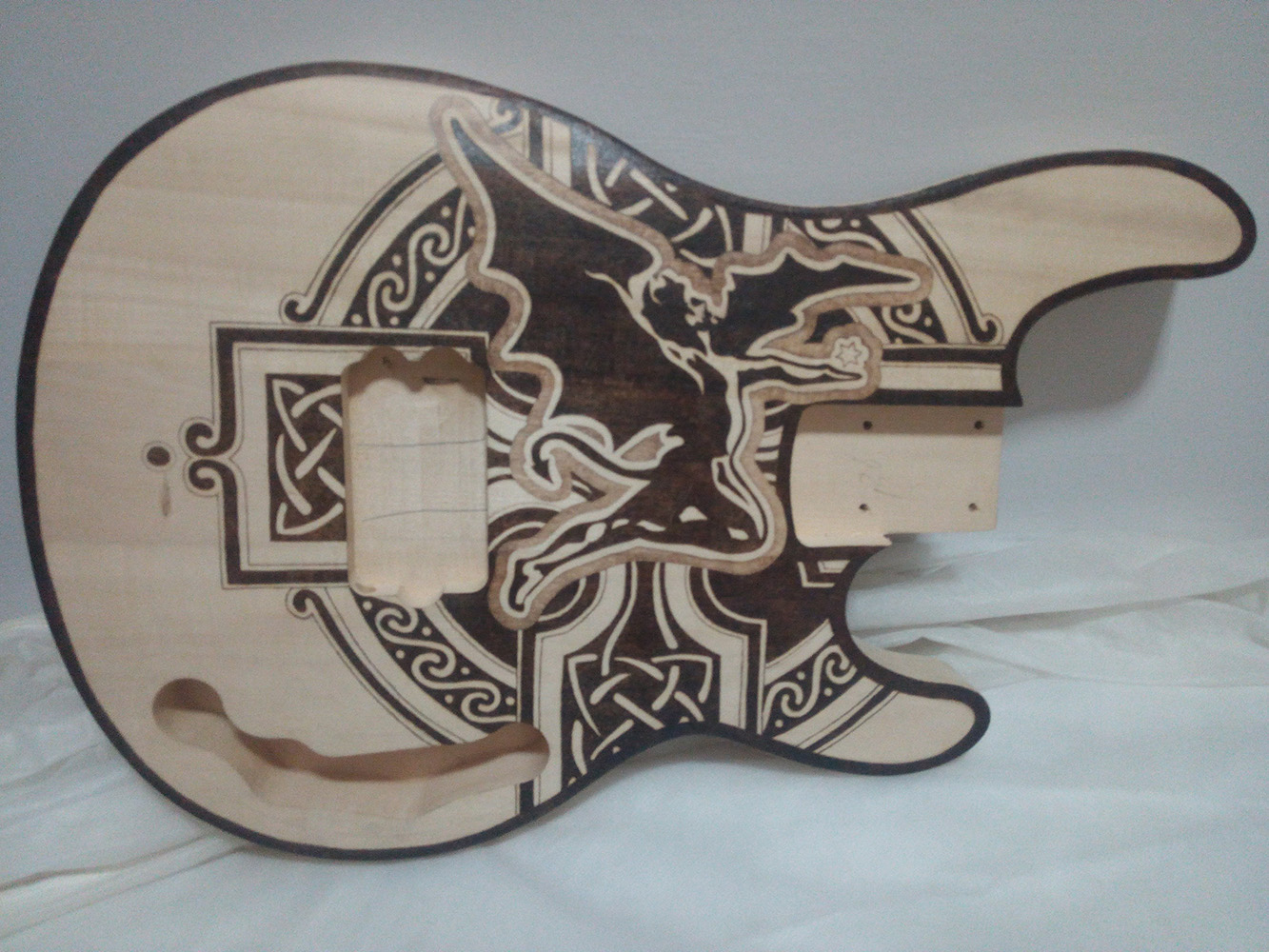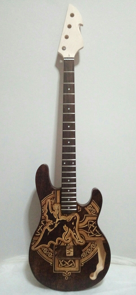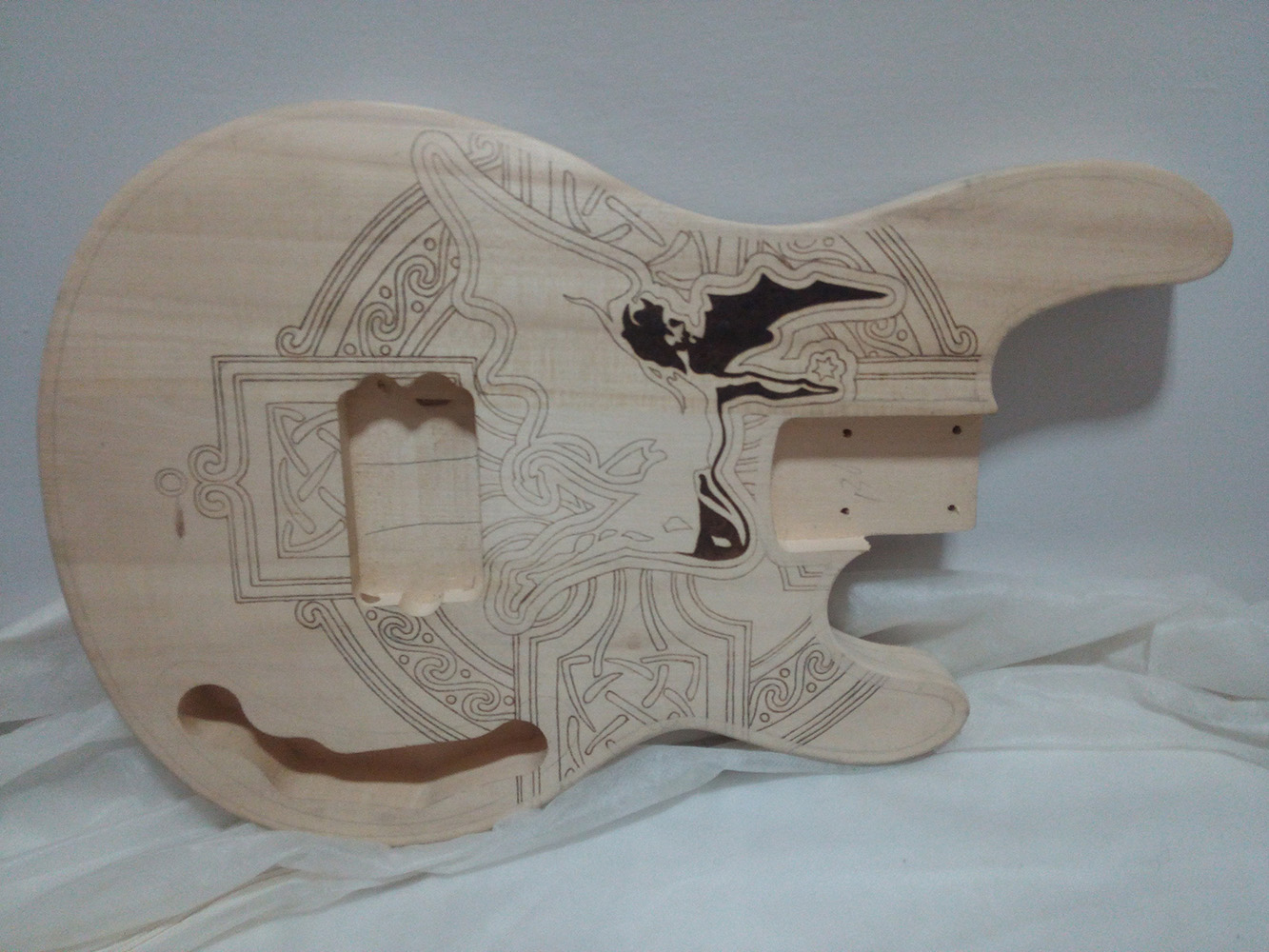 I'm almost lost for words. The time, effort and intricacy in creating this burned masterpiece is just mind-boggling. Angels and demons with hints of celtic and norse elements, you could spend hours just admiring it. The black hardware is the perfect subtle choice with the body colour, and allows the burning to shine without distraction. The only slight detraction for me is the headstock shape makes it look slightly over-sized to my eye. I love the shape, but it just seems a touch large. Stunning build.