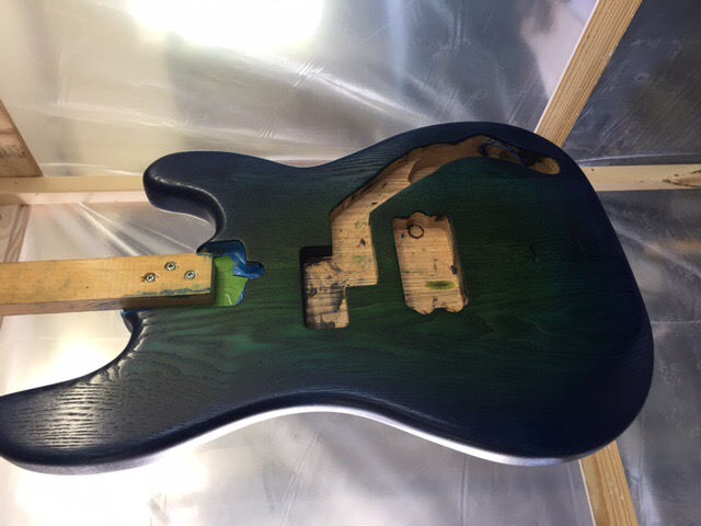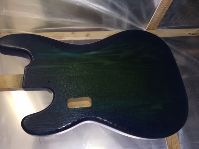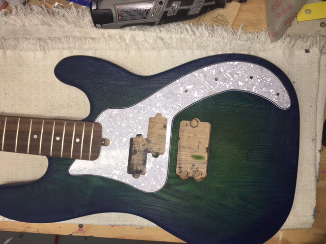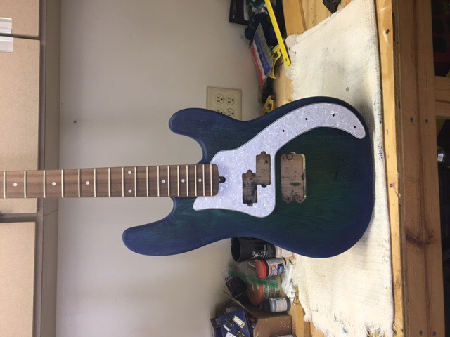 Well I got home from vacation and couldn't wait to work on my two bass builds.. I completed my very first custom pickguard. I am pretty satisfied with it. It's not perfect but I learned a lot. Now I am spraying polyurethane coats. I realized that when I stained the body with the water based dye it pulled out a fair amount of the timbermate. But that's ok I guess I will just have to lay down many coats of clear to fill in the grain.. but I am very happy with the color..
