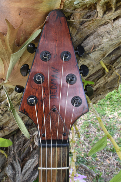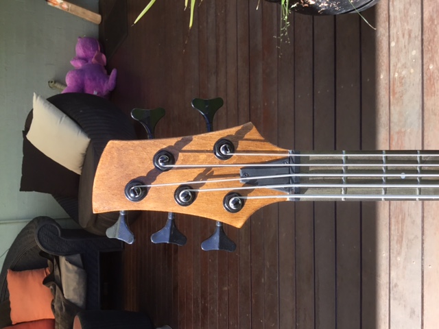 A beautiful dark burst with some impressive gloss. An innovative solution with the custom saddles to correct the action, although the kink on the higher strings worries me a little. I hope the saddle slots are deep enough to keep them in place. A great shape for a bass and nicely finished. I love the contrast been the headstock face and back of the neck. Great result.
