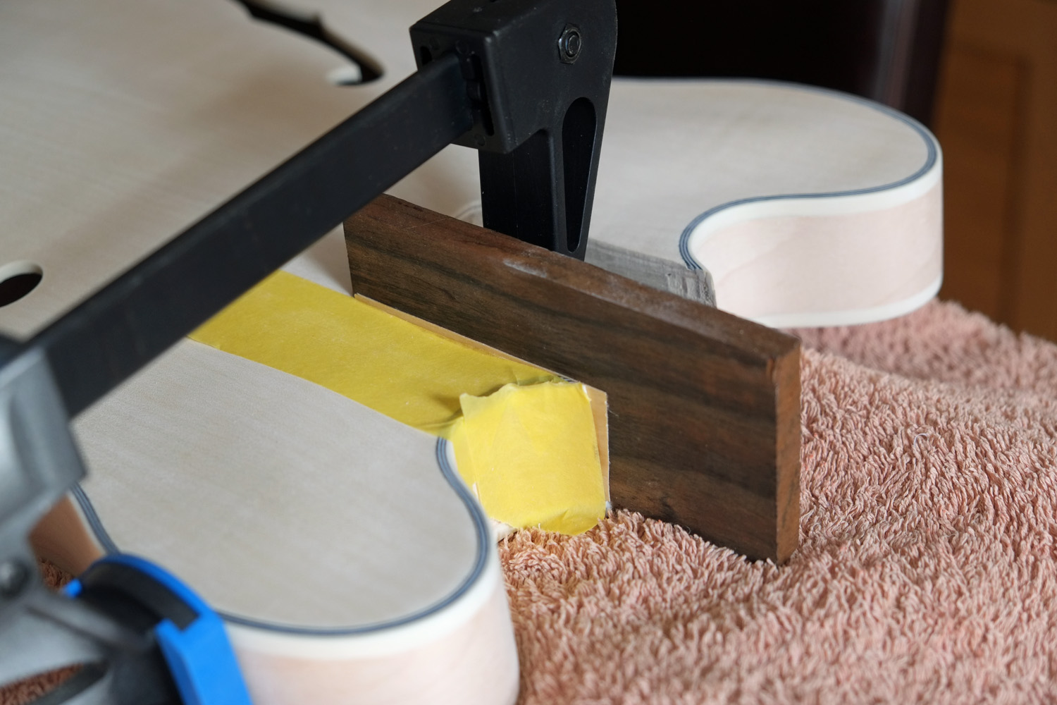 Finally got round to addressing the over-wide neck pocket, so am in the process of gluing a maple veneer piece to one side of the pocket. I'll be gluing another piece to the other side tomorrow when this one is dry.