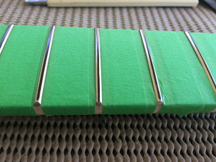 Once the neck has been levelled and taped off you grab a thick felt pen and run a line down the length of each fret.