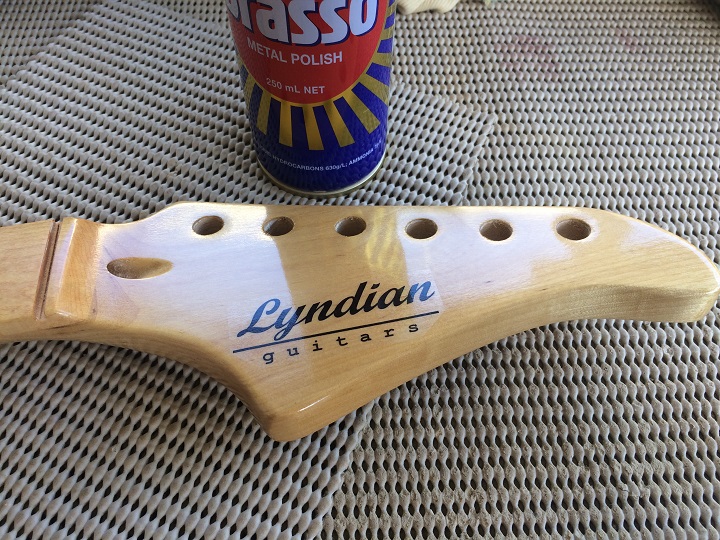 The fretboard got about 14 coats of Poly, the neck 7 coats and the headstock the full monty, 21 coats. It has ambered up a bit more than I had hoped, but I don’t mind it. I think it might be getting a bit old and thick. Oh, hang on, I think that’s me.