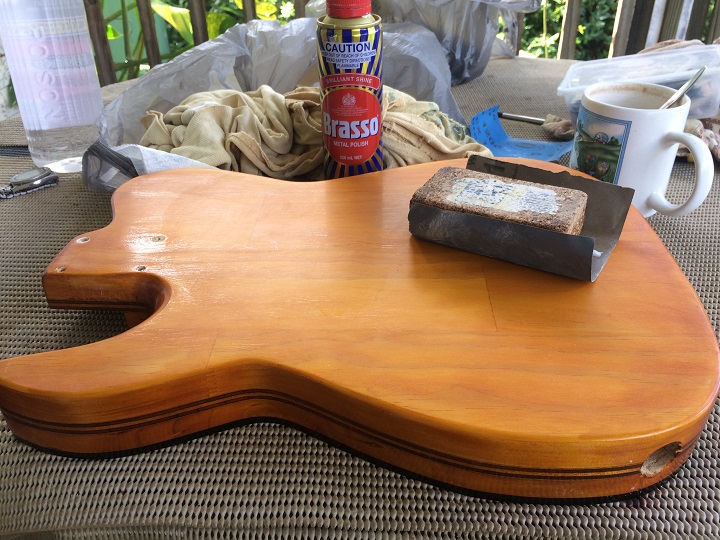 On the FrankenWashie resurrection I have left the timber raw, though polished up to the max with Micro mesh. Even though it is polished there is a subtle tactile difference between the Vic ash, the merbau, the Matai and the maple of the neck. It feels different under you hands than something coated, painted or oiled.