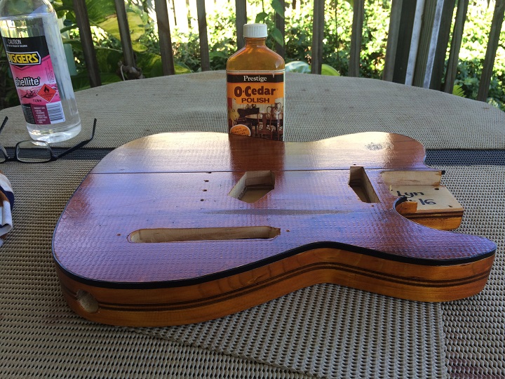 I am usually a devout Tru-Oil man, but seeing as I still had some MinWax Wipe-on Poly left over from my last guitar I used that instead.