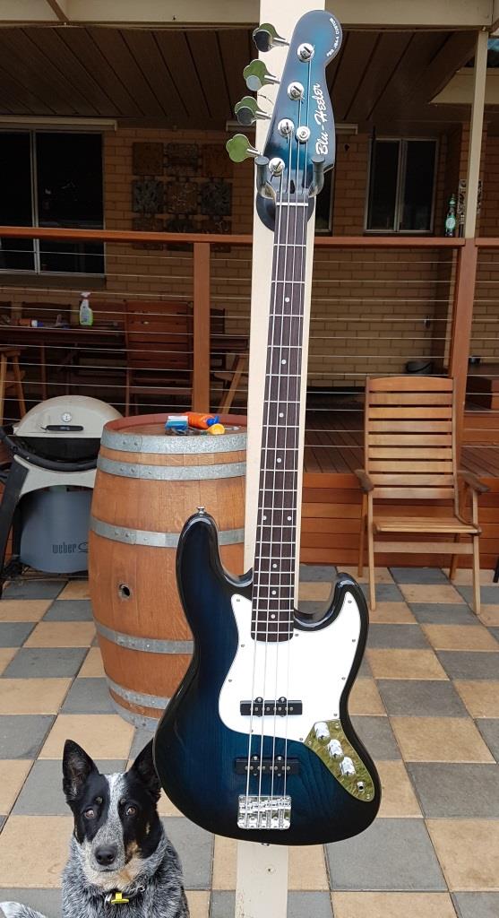 Wow Wow Wow. I love the colour on yet another high figure Ash Body. Stain and a great finish. Love that the grain shows through and yet the finish is shiny as well. The blue burst is so nicely done. White lettering on the headstock in a curly shape....what a great idea...and executed so well. This is so very well done. Great Bass done so well.