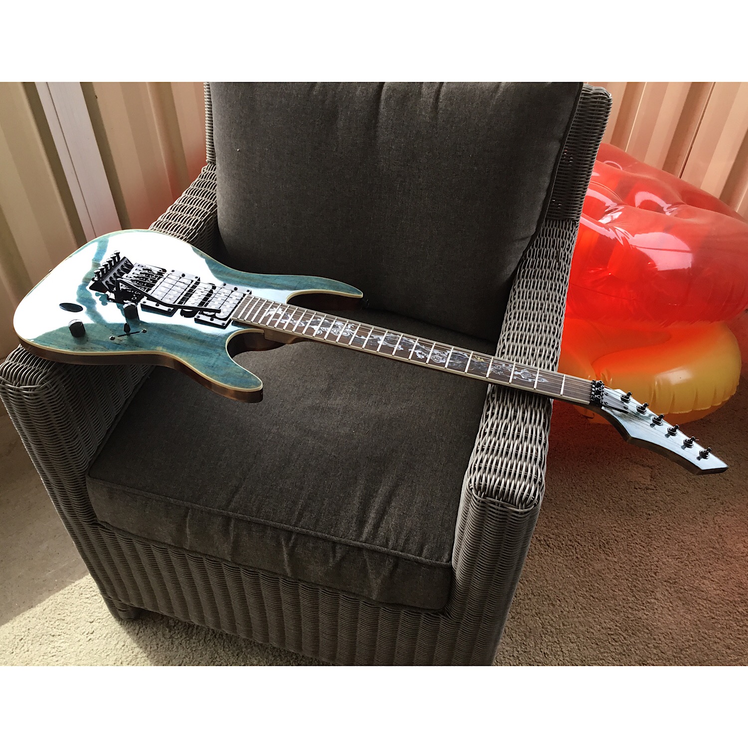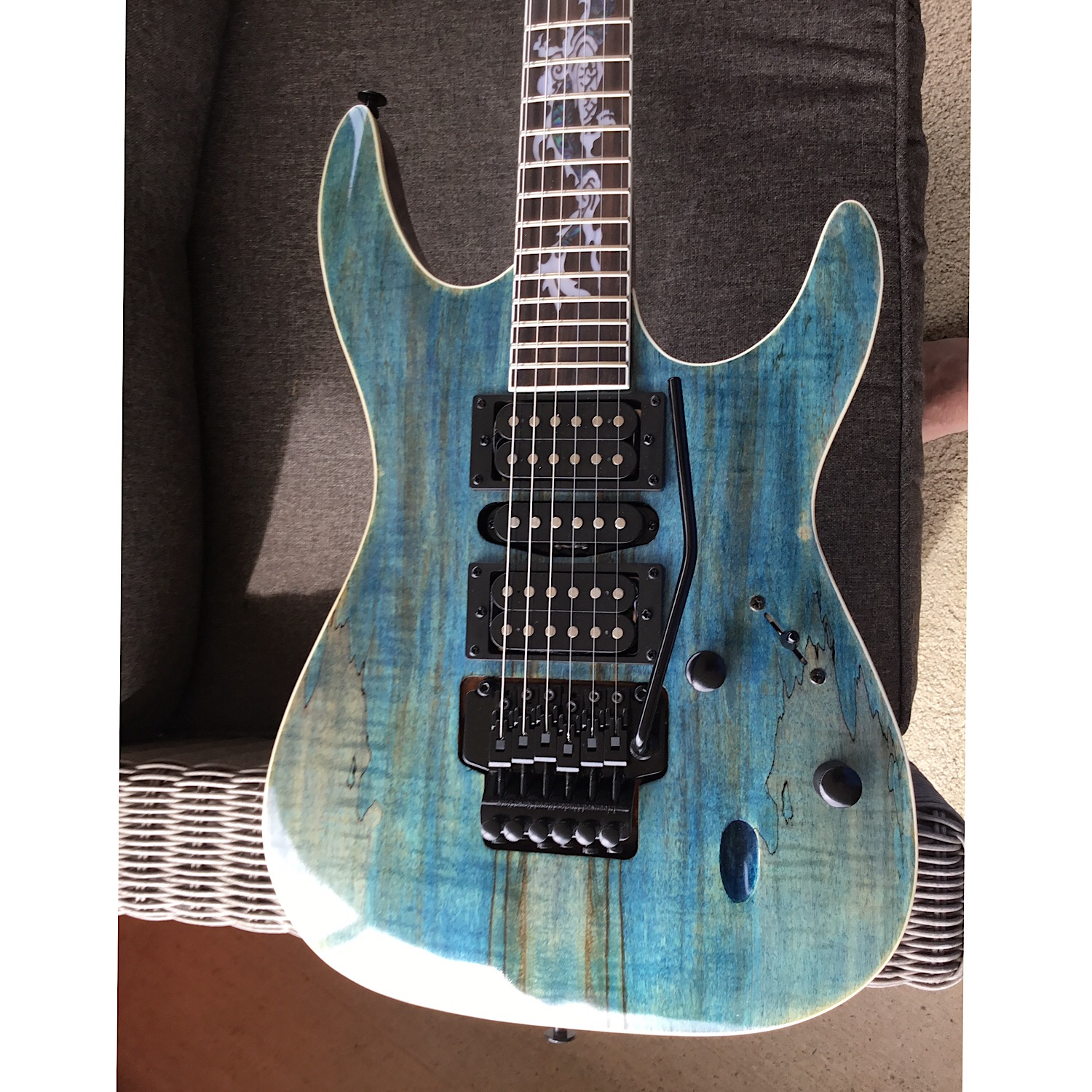 Brave move staining a spalted top and the light DT Bondi Blue tones have complimented rather than detracted. Brilliant faux spalt job on headstock which has a logo. Back and sides done in the darker colour also provided a strong contrast that looks great.