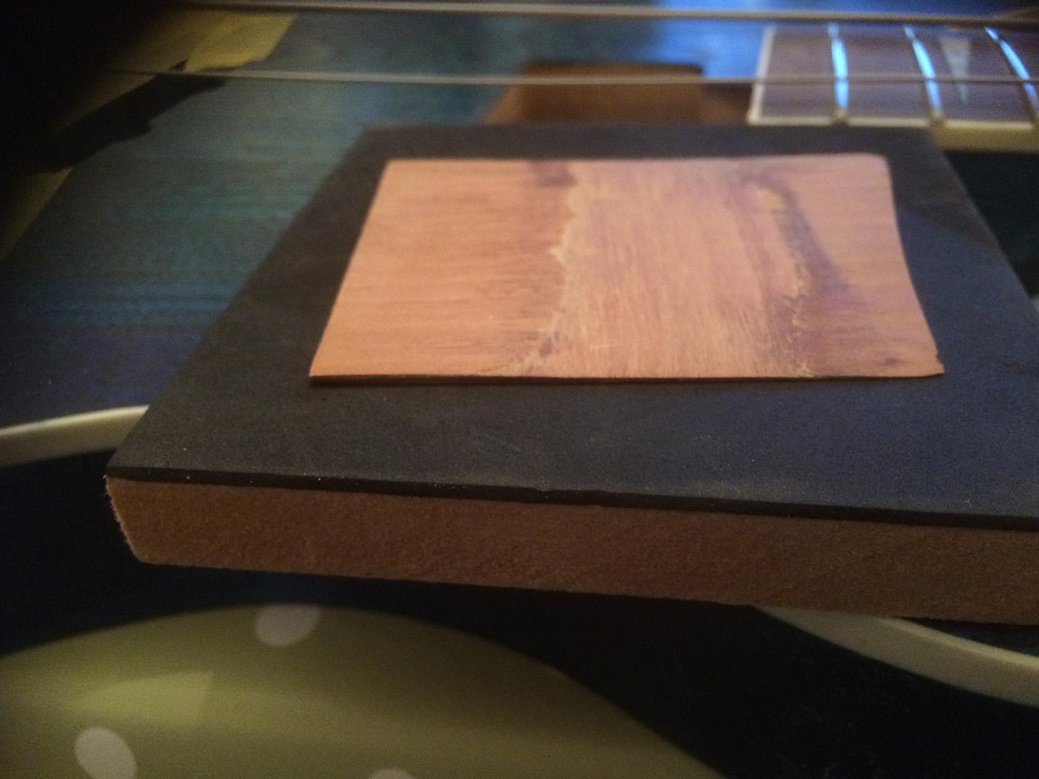 First attempt was cut from a piece of mahogany on my bandsaw... I estimated that something around the 2mm mark at its thickest would be the place to start then sand it down to get the string action about right... the thinnest I managed to cut without breaking was about 4mm at the thick end so it time for a re-think (and I really didn't want to spend too much time on it as I wasn't really sure if it was necessary). So rather than try to reduce something to the correct size I decided to step laminate three pieces of cherry veneer I happened to have, alternating the grain like plywood. I sanded the stepped side smooth and ended up with a shim 1.75mm at the thick end tapering to a wafer-thin 0.25mm. I trimmed it to size leaving the thin end 2-3mm short of the joint line so that it won't be seen and also so that the shim effectively tapers to nothing.
