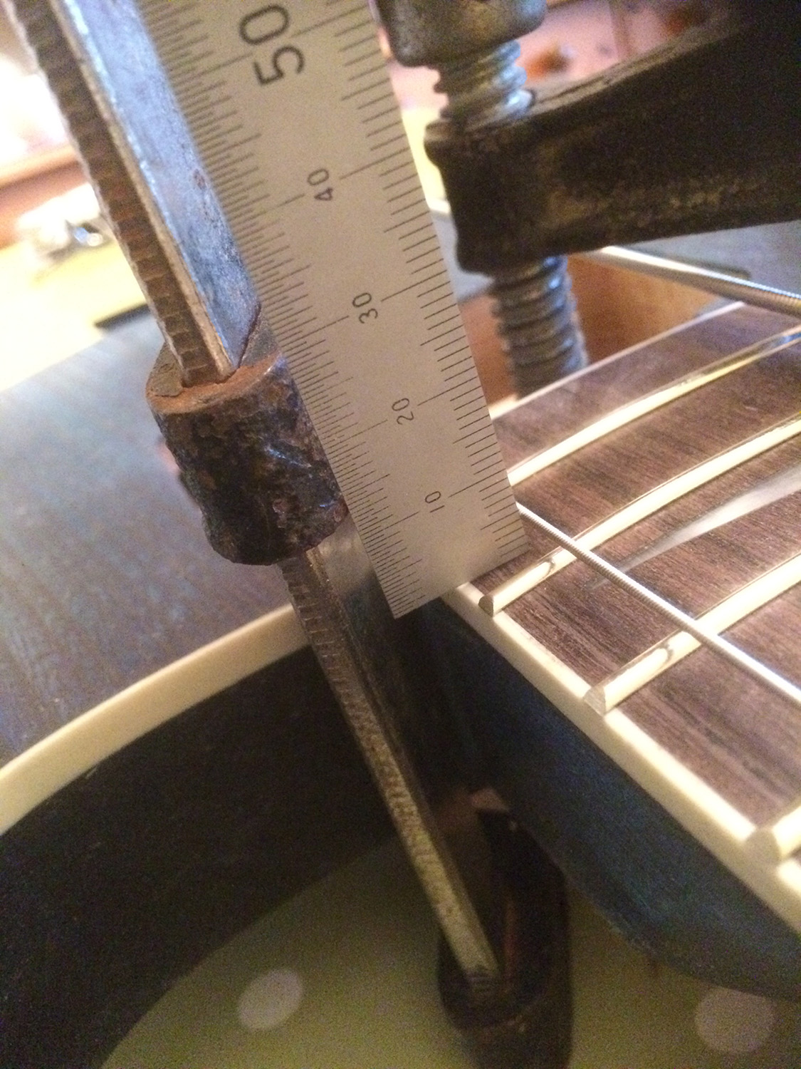 With the neck and shim clamped in place, I adjusted the bridge so that the bridge could still be lowered a bit then measured the distances at the penultimate fret at the body end (I couldn’t get access to the last fret as my F clamps were in the way). I took measurements with open strings (the nut seems quite high at the moment) and also with a capo strapped accross the twelfth fret: