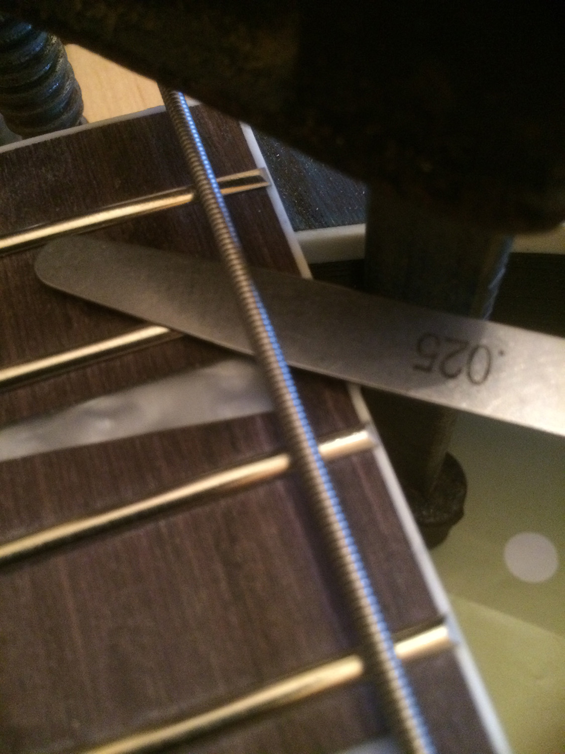 I like a low action – as low as possible without rattling the frets unless I really dig in. Using the shim, the string height seems great to me, especially when fretting higher up the neck. There seems plenty of bridge adjustment to raise or lower the strings and I’ll either remove the nut to sand off the bottom or file down the slots at a later stage… but before I get the glue out DOES ANYONE HAVE ANY COMMENTS? as I’d hate to do something foolish here…
